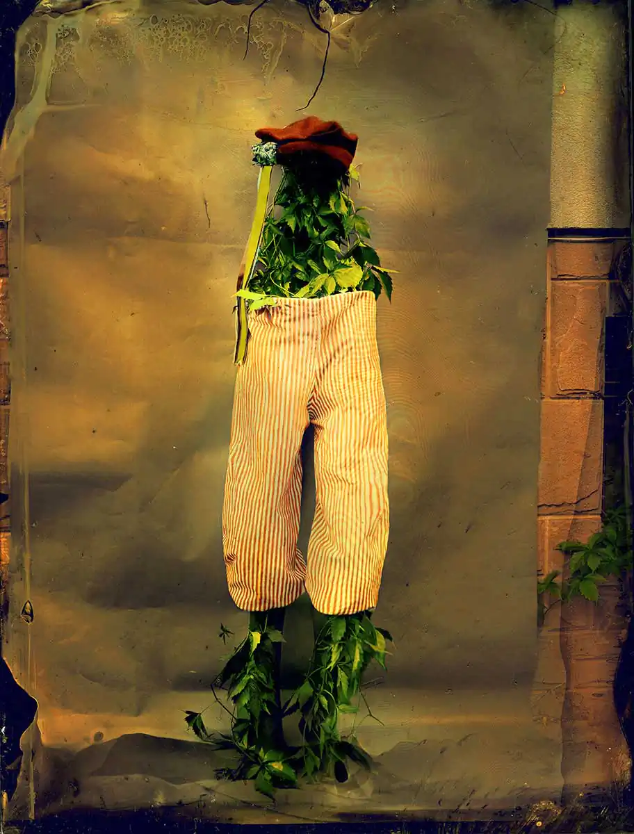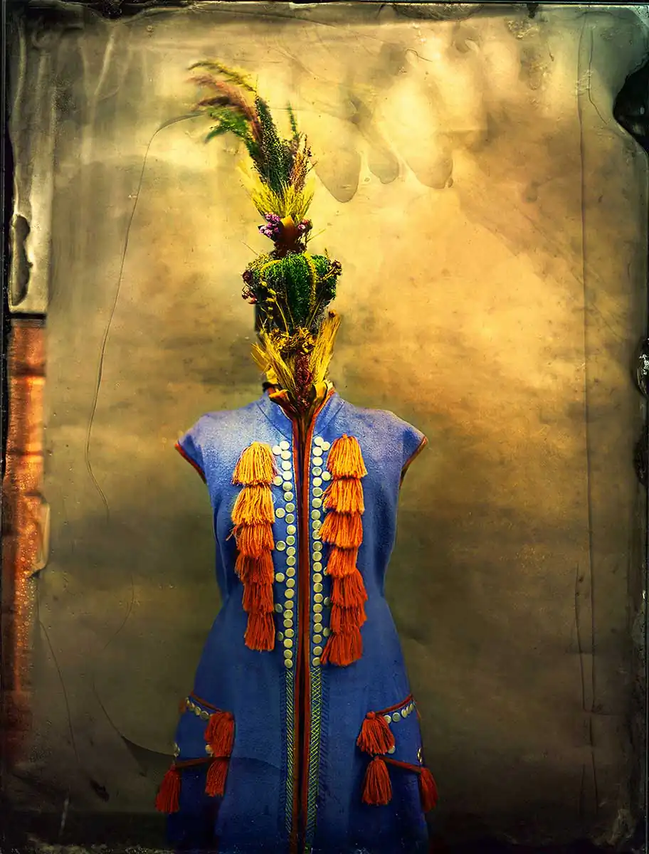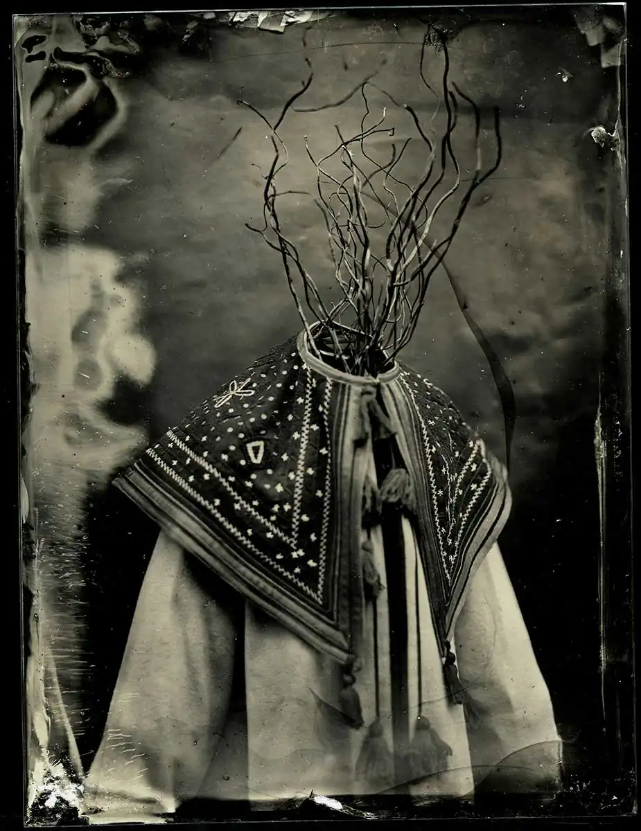 It explores Slavic culture and is informed by pagan traditions that have been a part of my past, drawing upon connection between human and nature. Every photograph has originated as physical object-a glass plate. Original folk garments taken from the closets of polish museums bear the forgotten traditions-the figure of mythological Turon-that welcomed a new year or traditional costumes of Cracow-are authentic ritual costumes.