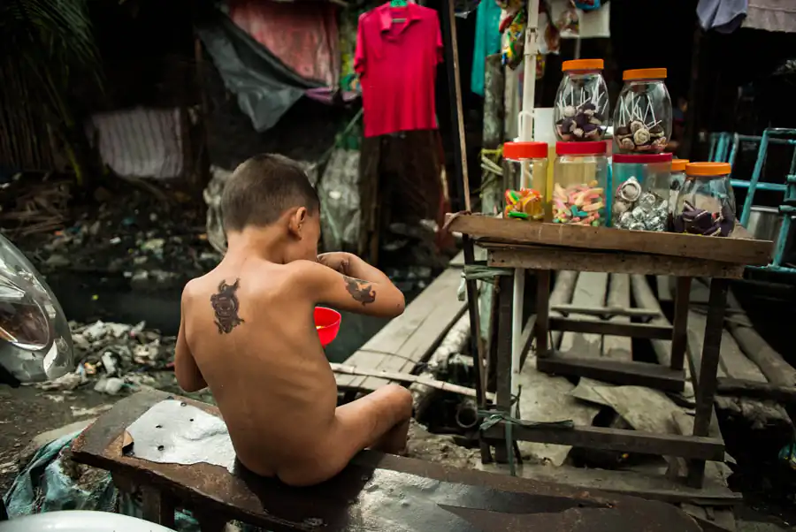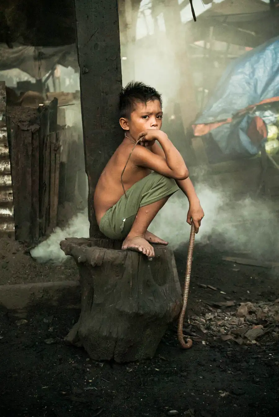The children did not know anything more than this isolated place of poverty. They try to live a normal childhood, playing in the waters that flowed next to a shipping harbor. A boy by the name of Reynixon Roysales has been living in Smokey Mountain since the age of six, along with his Mother, Father and Sister. He spends his days rummaging through piles of garbage in hopes of acquiring plastic to afford a meal that typically consists of instant coffee and rice as well as looking around the house for abandoned duck eggs to eat. The hope of a future keeps the spirit of this boy alive.