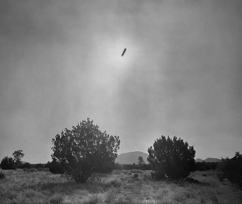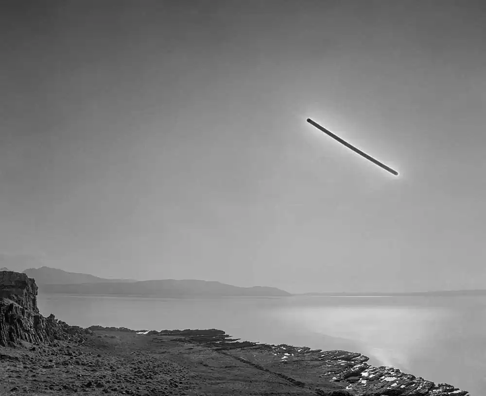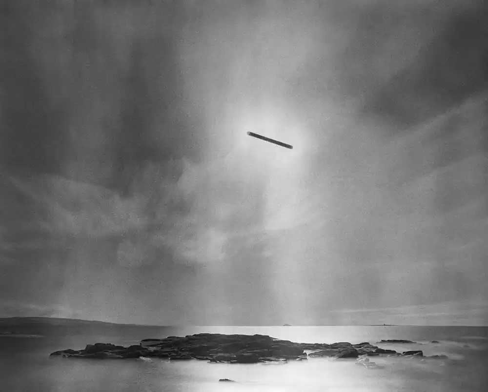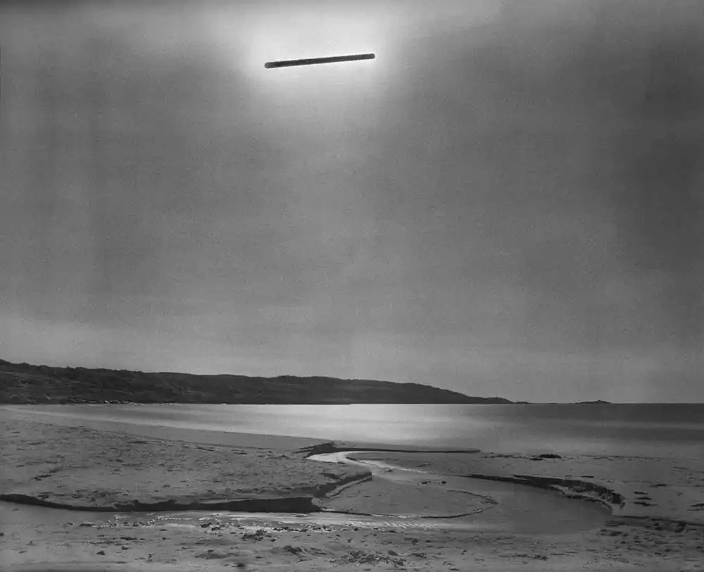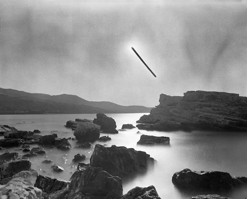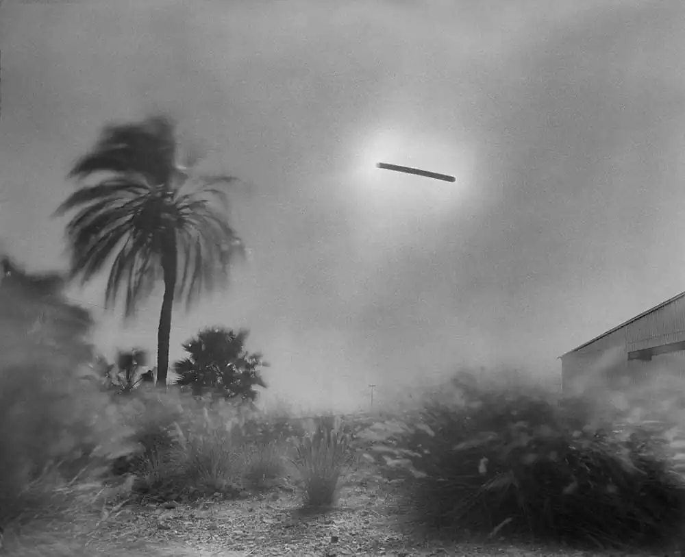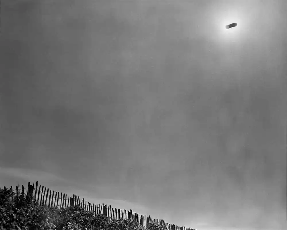 The length of the exposure causes the film to solarize, turning the sun’s path into a dark, vaguely extraterrestrial streak cleaving across the sky in each frame. The exact time of each exposure is dictated by the duration of specific phone calls, allowing inferences to be made about the nature of the relationship and conversation that each photograph records.