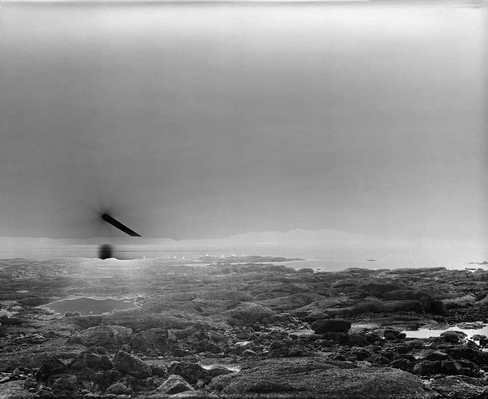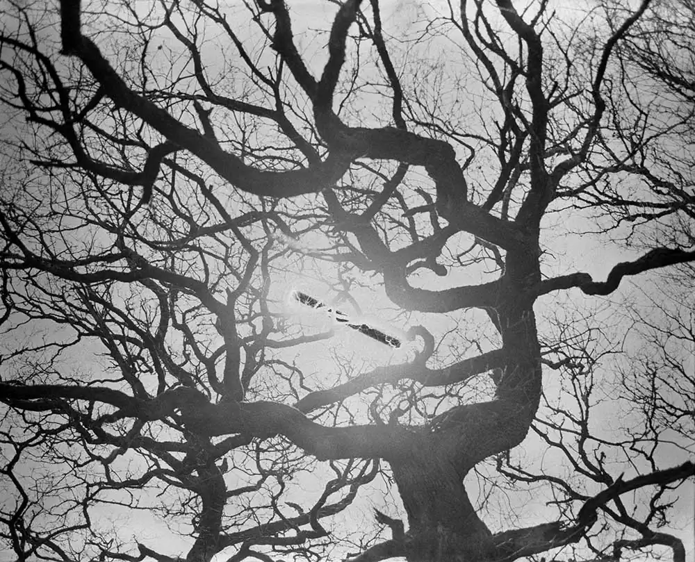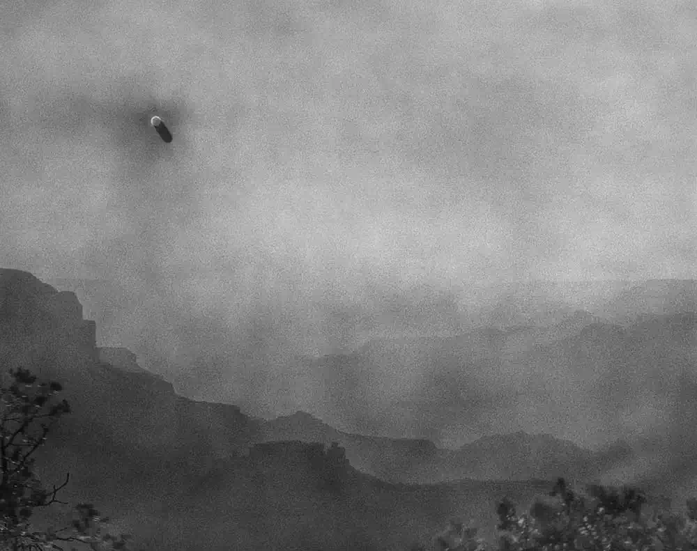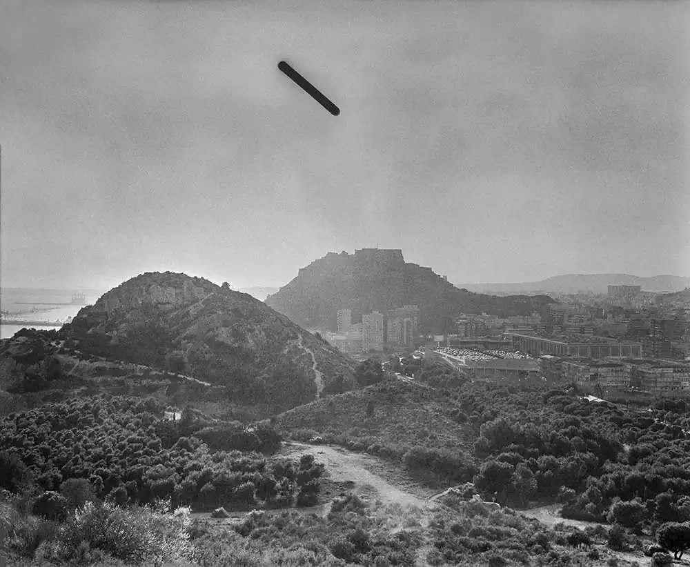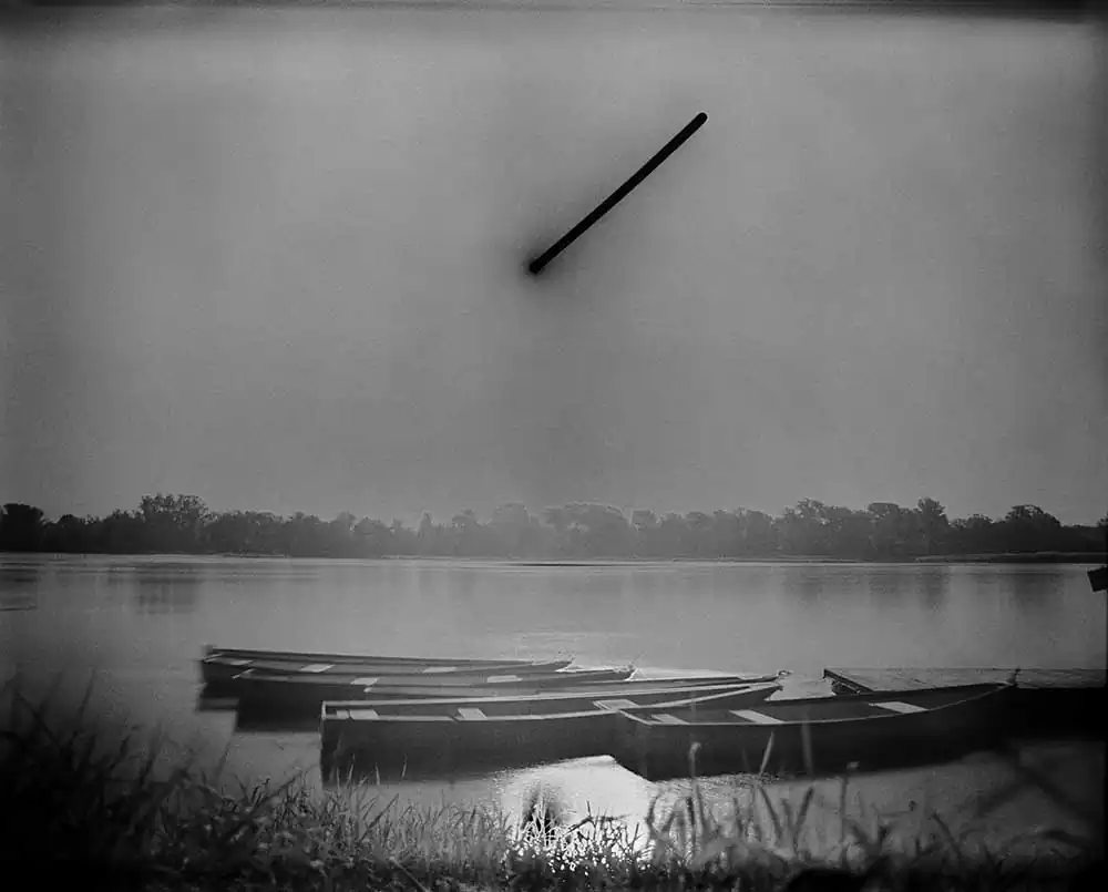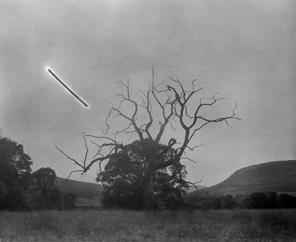 The length of the exposure causes the film to solarize, turning the sun’s path into a dark, vaguely extraterrestrial streak cleaving across the sky in each frame. The exact time of each exposure is dictated by the duration of specific phone calls, allowing inferences to be made about the nature of the relationship and conversation that each photograph records.
