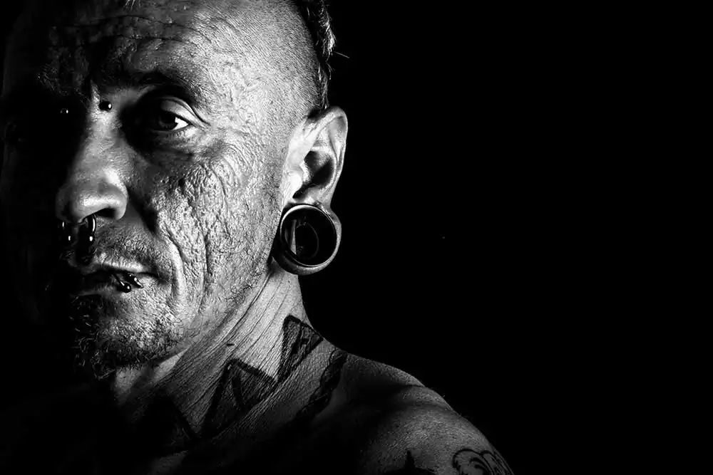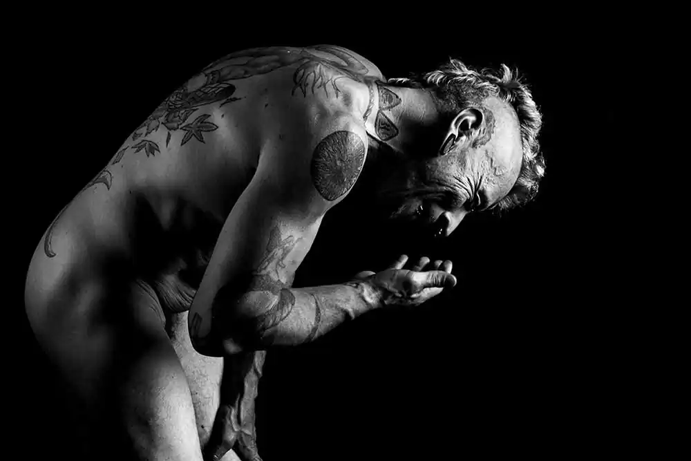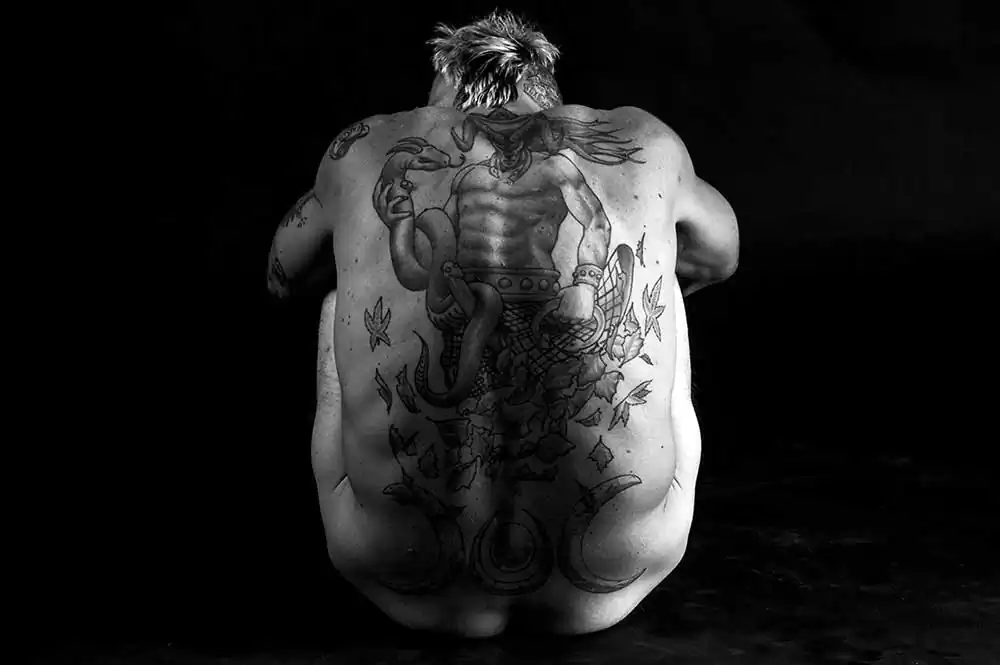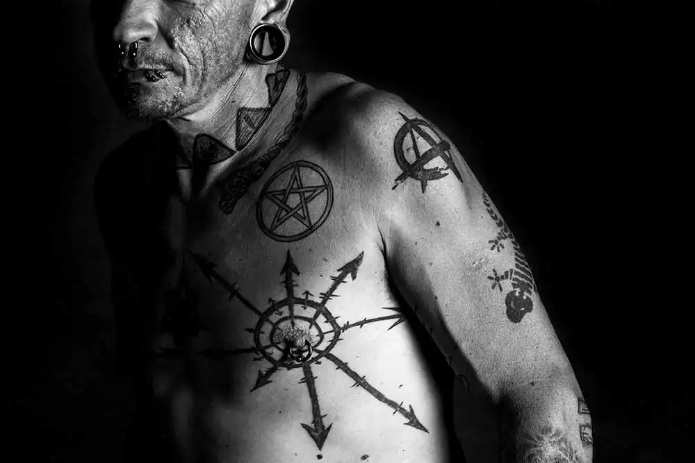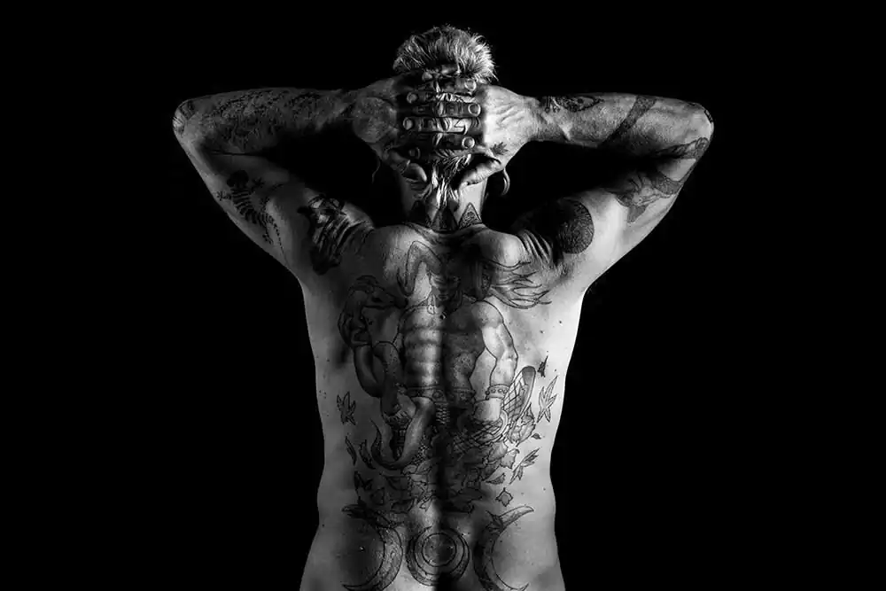 A man covered in tattoos talking about spirituality and religion, but in their eyes they were just tattoos, something that only prisoners and good-for-nothing can have on their skin. An old question between being and appearing; to be a man of medium-high culture, with a deep spirituality and humanity, a scholar of religions, but to appear as an outcast of a society that judges people how they look like. For these reasons I decided to photograph this man and his skin in a photographic studio, as one does with a fashion model; someone who represents the importance of appearing above being, but accepted as normal and good. [Official Website]