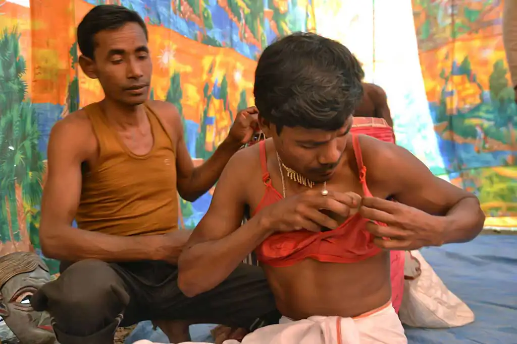 The dancers are all male, without exception, and portray one or many characters, male, female or animal.  All the characters are larger than life. The dancers become frenzied due to the extra efforts they have to put in.
