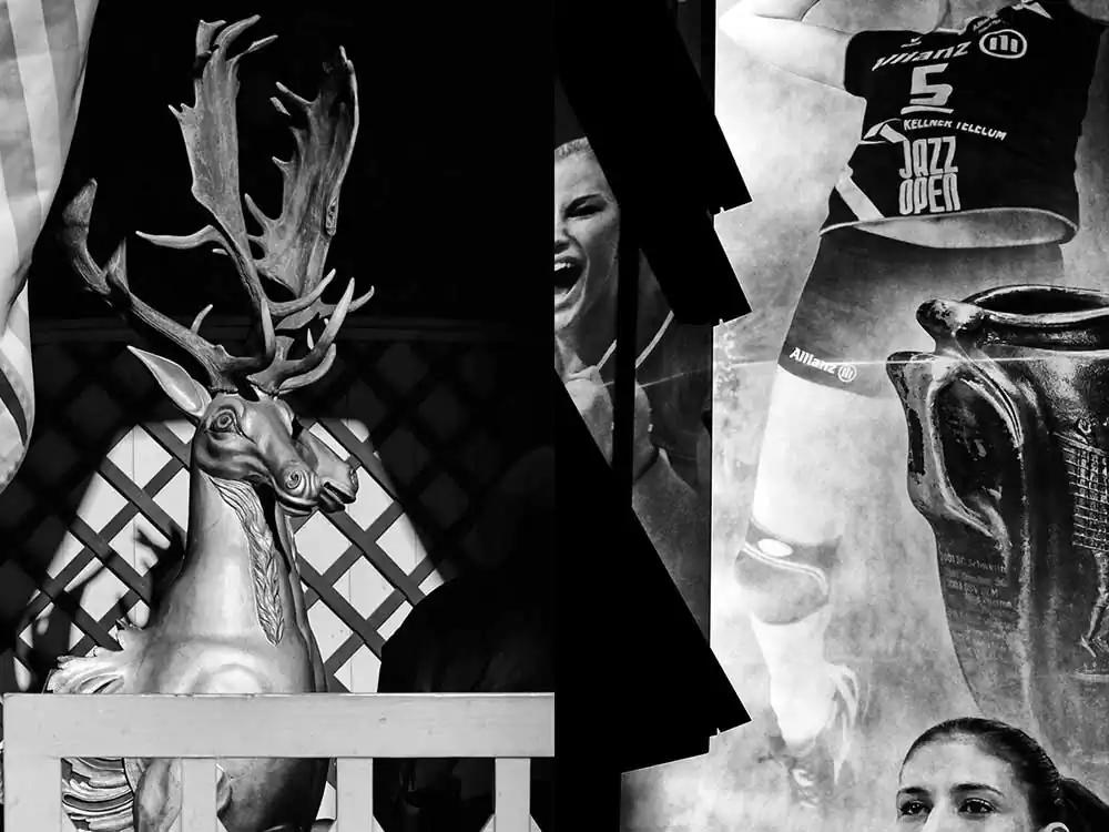 Raschka shows the fictional reality on the streets in a new way through unusual perspectives and b&w. The absence of colour emphasizes the connections of these complex urban constructions, which are essential parts of human perception levels. The presentation of the images as image pairs highlights the confusion of senses, but it is the eye of the viewer, which holds these different realities together.