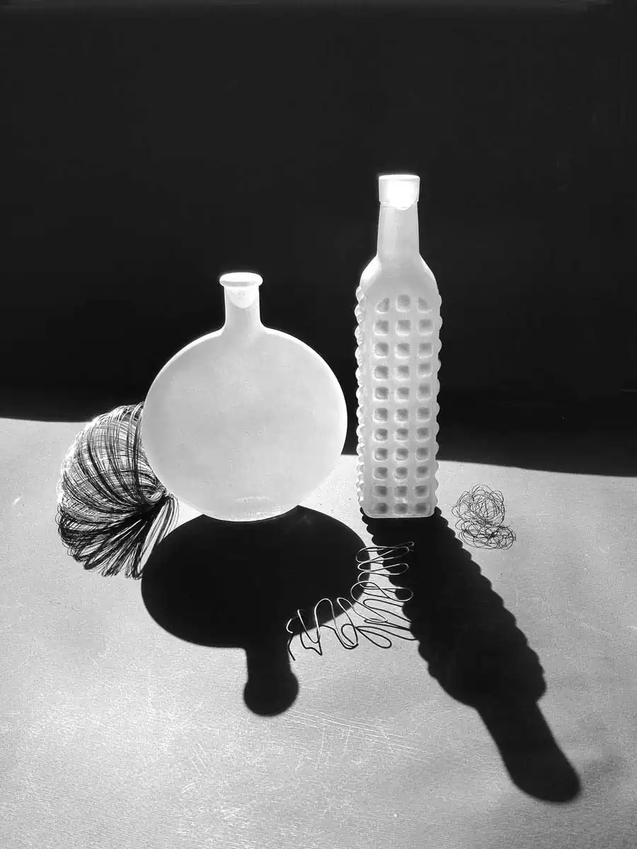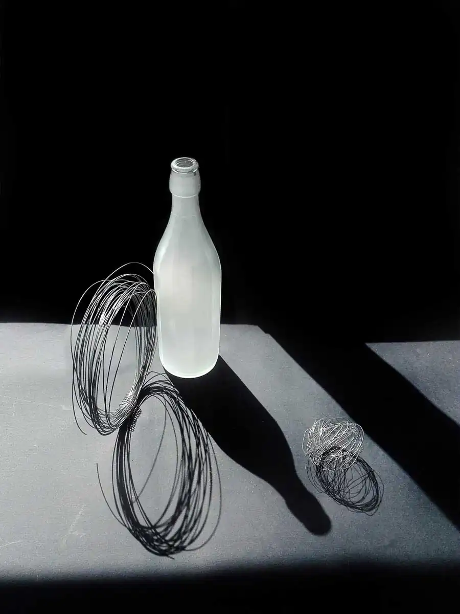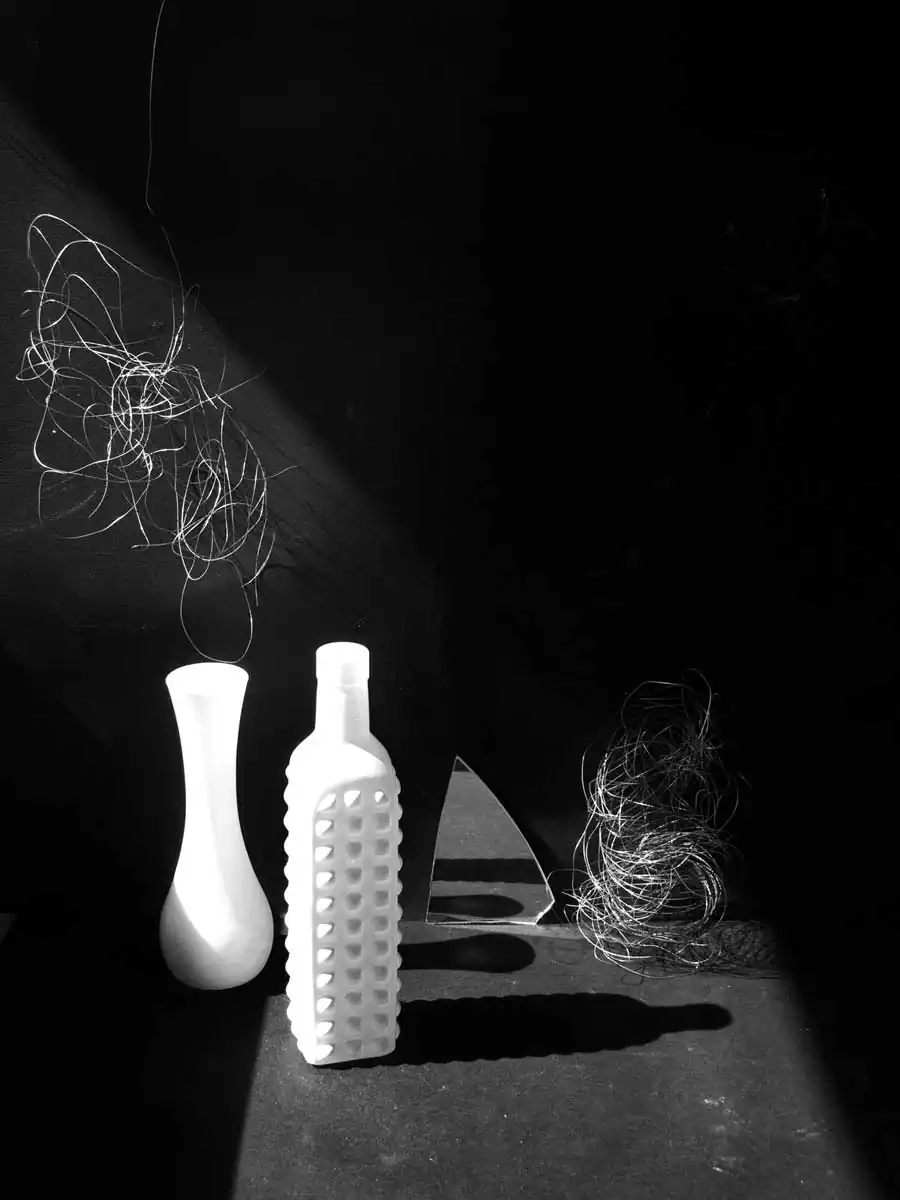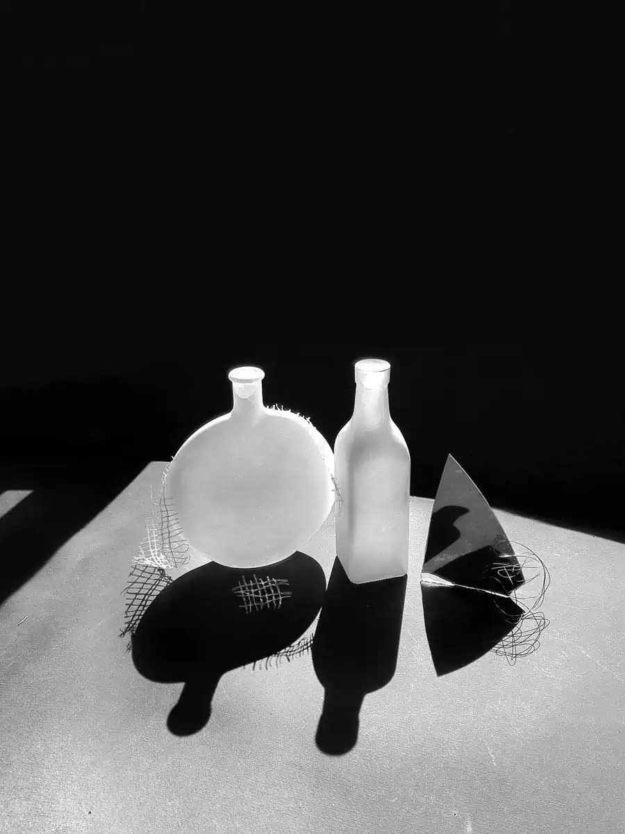 Even in the observation of reality we realize that even most common objects get particular visual aspects thanks to light. My pictures may recall the theory of shadows in descriptive geometry, or something similar realized with a camera, or with a smartphone, in substitution of a Radiograph, with bottles instead of solids. For this we study the theory of shadows, application of descriptive geometry that deals with effects produced by light on an opaque body, giving its scientific explanation (the theory of shadows recalls the theory of oblique projections, given by G. Mone). To make these still lifes I always took pictures from 9.30 to 11 am, and only if there was the sun, which I chose as bright source, that projected shadows on a definite support plan. These pictures are a middle way between  a strict geometrical synthesis and an imaginative compositional study. To strictly white jars and bottles I often pull together a small broken mirror that recalls the sail of a boat and reflects the shadows of bottles or light shapes which I created with wire. The shapes crossed by the lights seem to vibrate and become evanescent. For the choice of objects of my compositions I privileged contemporary and linear ones. The potentiality of ambient light let me accentuate contrasts and make all the drama emerge from shadows. The shadow of the bottle is almost a declaration of intents that overturns conventions of genre: the bottle, which is the usual protagonist, becomes completely decentralized from cuts of light, which decline the real object in support of its projection. All the pictures were both taken with a digital reflex or with a smartphone