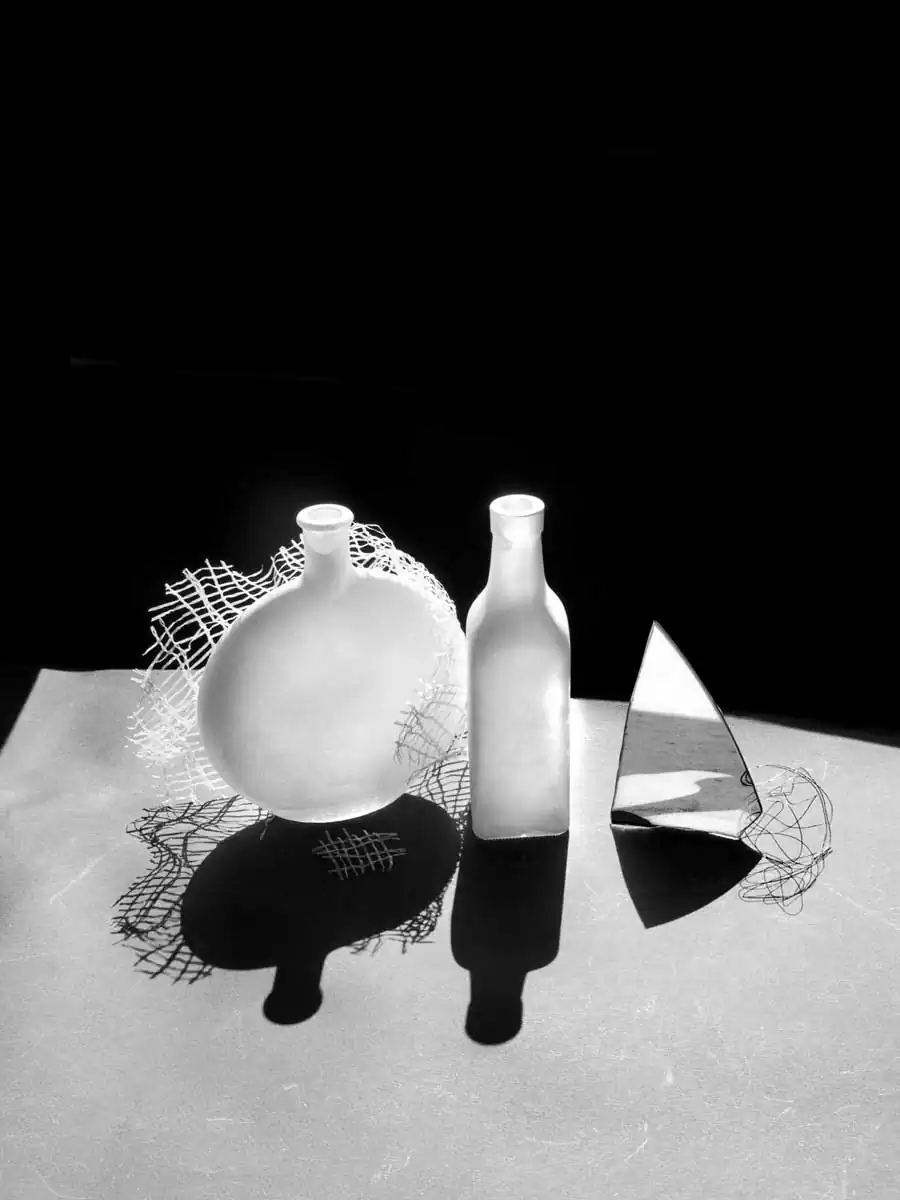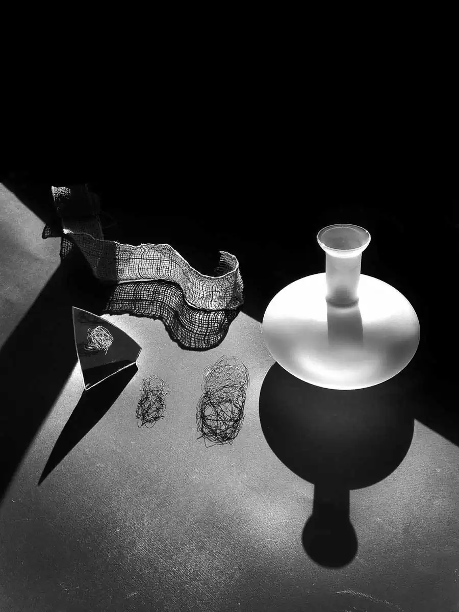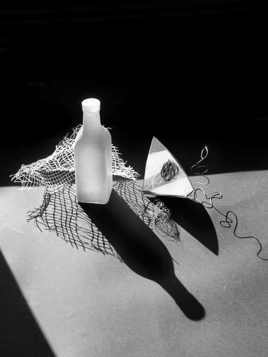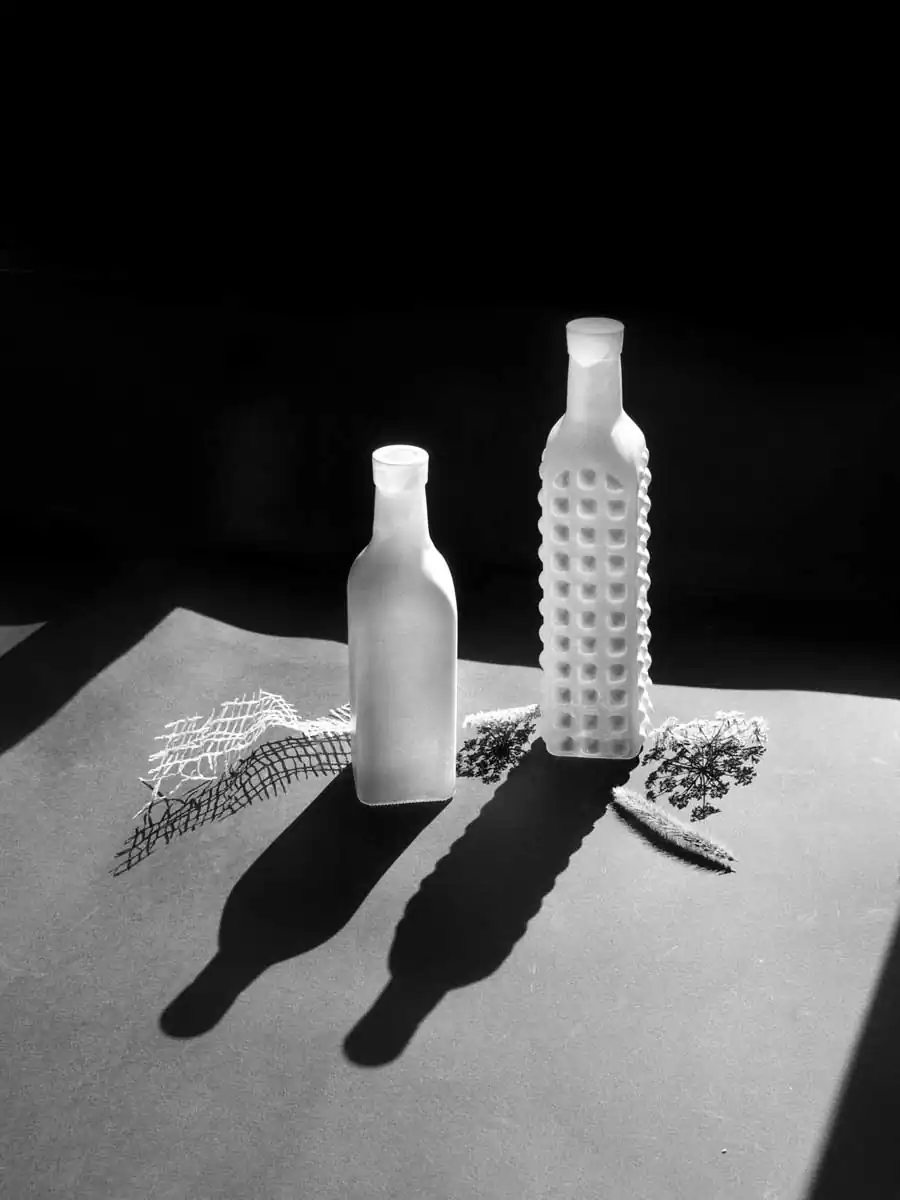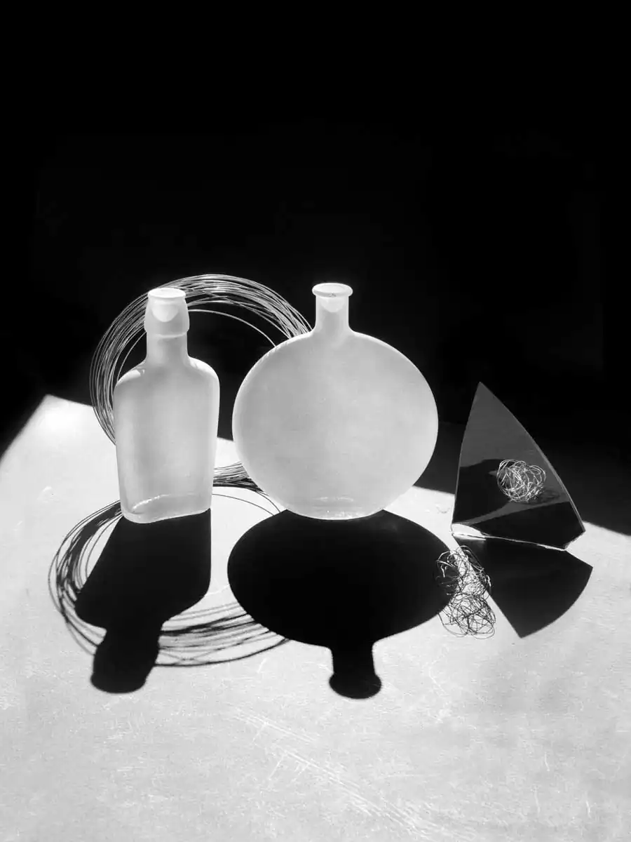 Even in the observation of reality we realize that even most common objects get particular visual aspects thanks to light. My pictures may recall the theory of shadows in descriptive geometry, or something similar realized with a camera, or with a smartphone, in substitution of a Radiograph, with bottles instead of solids. For this we study the theory of shadows, application of descriptive geometry that deals with effects produced by light on an opaque body, giving its scientific explanation (the theory of shadows recalls the theory of oblique projections, given by G. Mone). To make these still lifes I always took pictures from 9.30 to 11 am, and only if there was the sun, which I chose as bright source, that projected shadows on a definite support plan. These pictures are a middle way between  a strict geometrical synthesis and an imaginative compositional study. To strictly white jars and bottles I often pull together a small broken mirror that recalls the sail of a boat and reflects the shadows of bottles or light shapes which I created with wire. The shapes crossed by the lights seem to vibrate and become evanescent. For the choice of objects of my compositions I privileged contemporary and linear ones. The potentiality of ambient light let me accentuate contrasts and make all the drama emerge from shadows. The shadow of the bottle is almost a declaration of intents that overturns conventions of genre: the bottle, which is the usual protagonist, becomes completely decentralized from cuts of light, which decline the real object in support of its projection. All the pictures were both taken with a digital reflex or with a smartphone