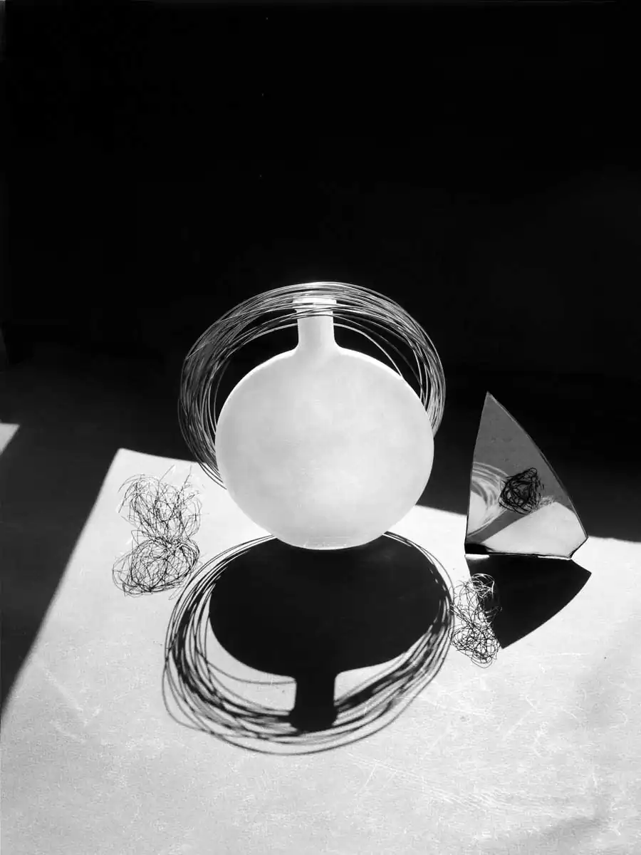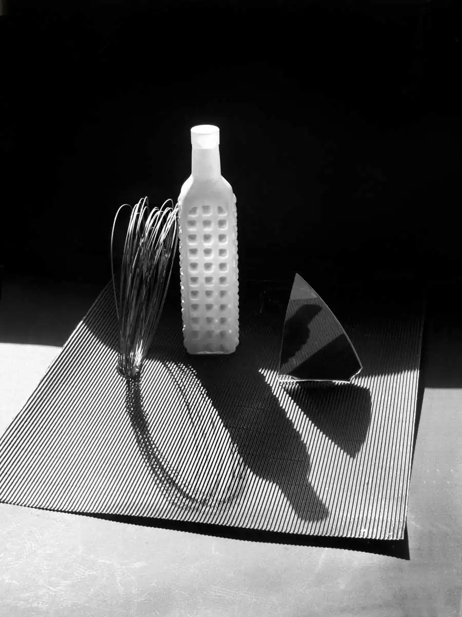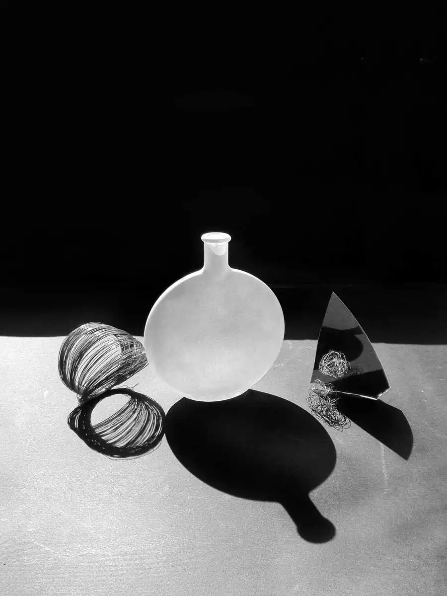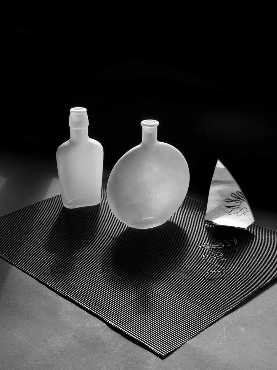 Even in the observation of reality we realize that even most common objects get particular visual aspects thanks to light. My pictures may recall the theory of shadows in descriptive geometry, or something similar realized with a camera, or with a smartphone, in substitution of a Radiograph, with bottles instead of solids. For this we study the theory of shadows, application of descriptive geometry that deals with effects produced by light on an opaque body, giving its scientific explanation (the theory of shadows recalls the theory of oblique projections, given by G. Mone). To make these still lifes I always took pictures from 9.30 to 11 am, and only if there was the sun, which I chose as bright source, that projected shadows on a definite support plan. These pictures are a middle way between  a strict geometrical synthesis and an imaginative compositional study. To strictly white jars and bottles I often pull together a small broken mirror that recalls the sail of a boat and reflects the shadows of bottles or light shapes which I created with wire. The shapes crossed by the lights seem to vibrate and become evanescent. For the choice of objects of my compositions I privileged contemporary and linear ones. The potentiality of ambient light let me accentuate contrasts and make all the drama emerge from shadows. The shadow of the bottle is almost a declaration of intents that overturns conventions of genre: the bottle, which is the usual protagonist, becomes completely decentralized from cuts of light, which decline the real object in support of its projection. All the pictures were both taken with a digital reflex or with a smartphone