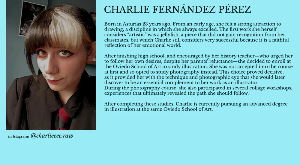 I met Charlie at last year’s Gijón Photography Encounters. Her series was one of those selected to take part in a roundtable with students from the Photography program at the Oviedo School of Art, where each participant presented their final degree project. I was deeply impressed by the theme Charlie chose and by the way she blended illustration and photography to visualize the dualism between the conscious self and the latent self within these individuals. At the end of the session, I approached her and proposed this interview.