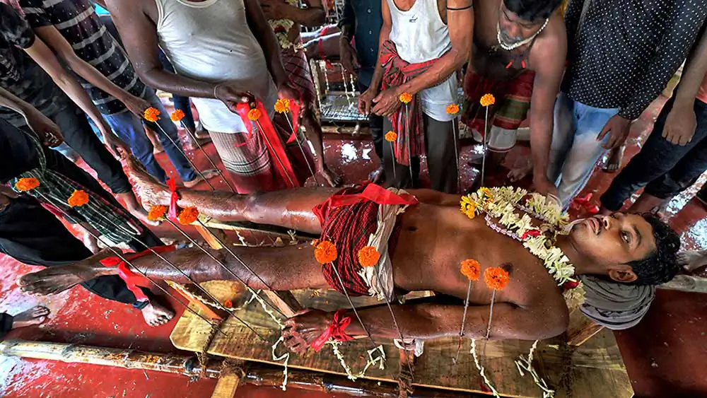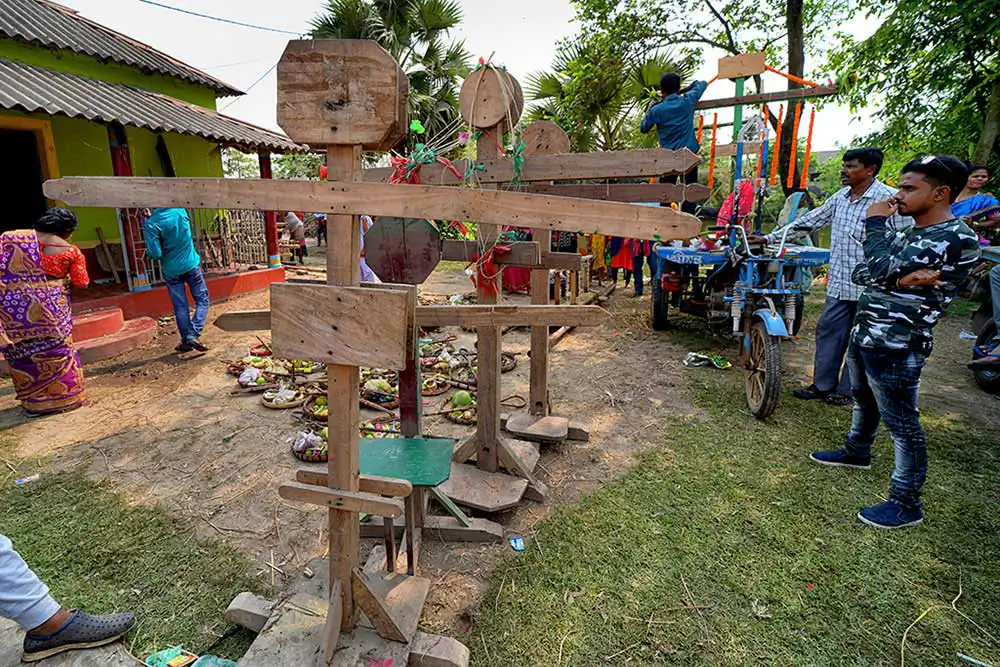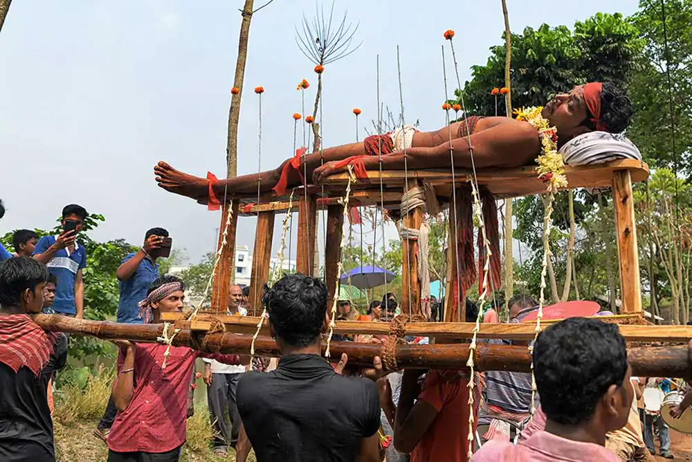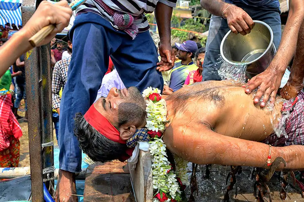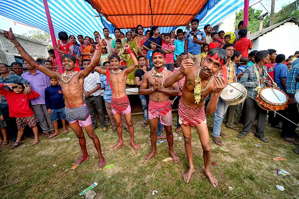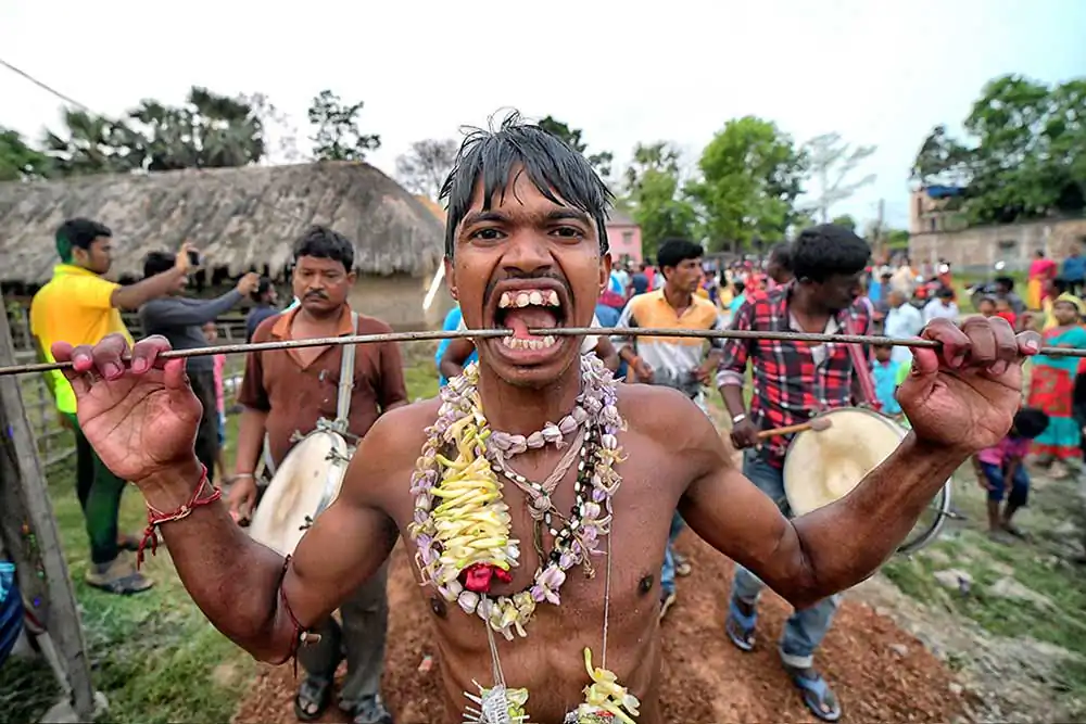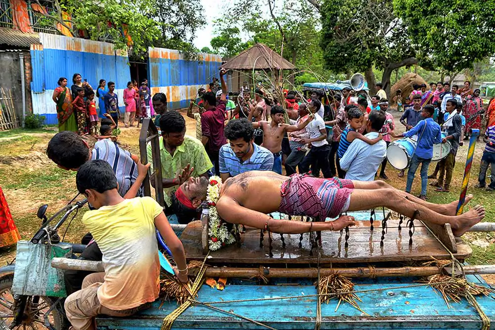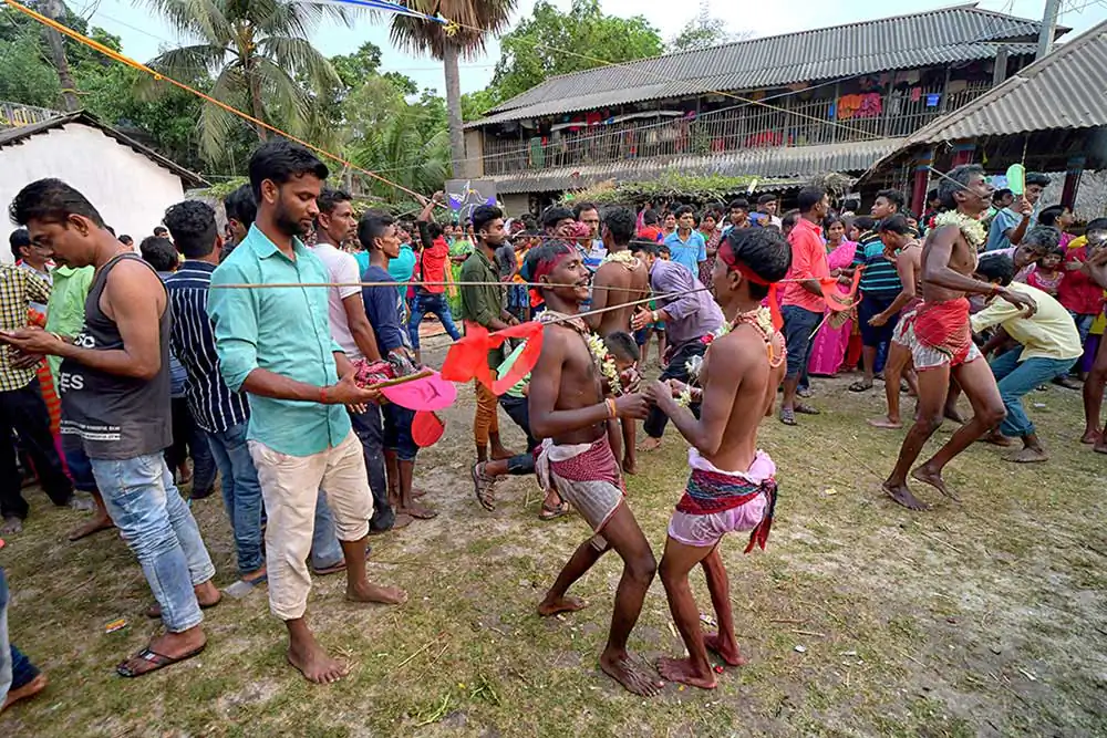 Participants of this festival are known as Gajan Sannyasi or Bhokta. Gajan is actually linked to those persons who are related to agricultural community, directly or indirectly. They pray for the rains and better harvest. Lord Shiva is said to be closely related to this community. It may be worth noting here that Dharmathakur is actually considered to be the God of Fertility. The festival is actually a festival to satisfy “Lord Shiva”, the great “Debadideb” of Hindu Religion. In Gajan festival, devotees worship Lord Shiva by injuring themselves through piercing of niddles, iron rods, hooks and by many other means in different parts of their bodies including tongue, lips, ear etc. They believe that through pain and injury, they could reach to the God.