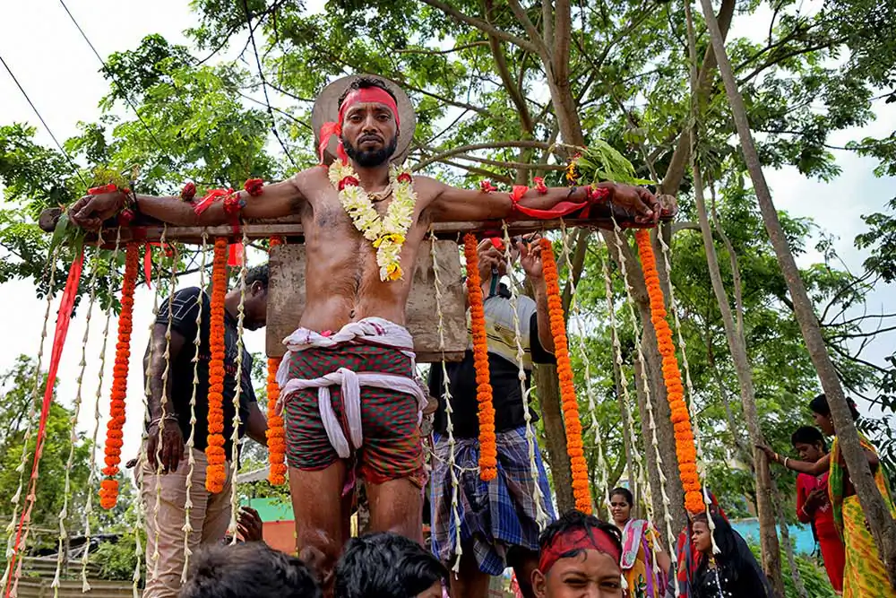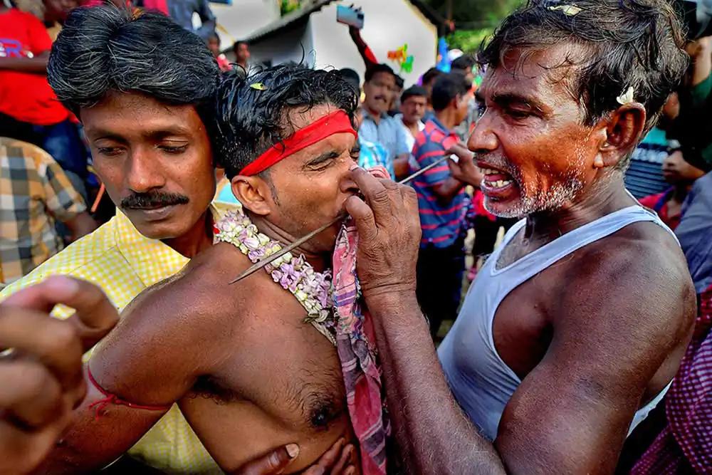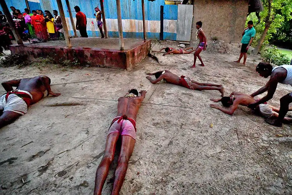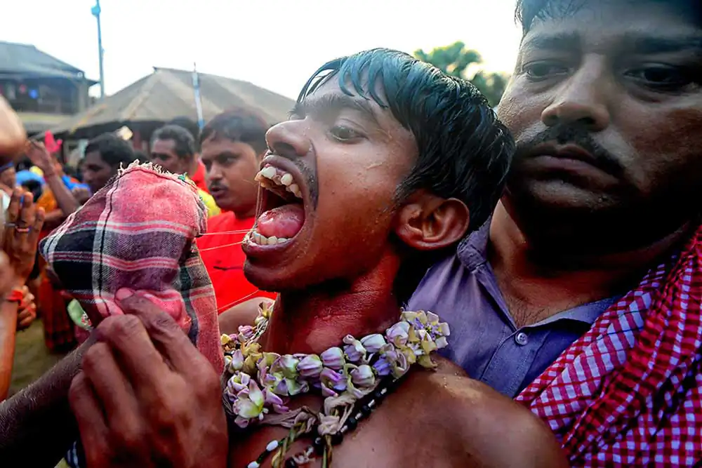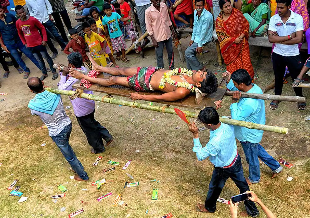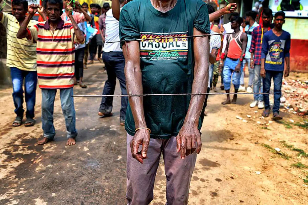 The photo story has been made on celebration of Gajan festival in a remote village of Hooghly district of West Bengal. The unique features of this celebration is that here villagers pierce iron rod in their body, tongue and crucify themselves by laying down on wooden framework with huge nails fixed on it. The ritual starts in the early morning in a temple of Lord Shiva with piercing iron rods in their tongue, bodies around 4 AM. The long iron rods are pierced from one end of their mouth or tongue to the other end and rods hang from both the sides. After piercing, Sannasis wait at the temple ground to complete whole process of piercing. After completion of piercing, Sannasir stated running through village road in a circular procession towards another temple of the village and then come back to their original destination. During this time, they dance facing each other balancing their long iron rods and it is very dangerous to follow them as one might be injured due to sharp edges of long iron rods. During this festival, drums and rural songs are played in loudspeaker so loudly that one can barely hear another. All Sannasir are in bare bodies, wearing only small langot, as Indian village wrestlers wear during wrestling. After reaching original destination, then slowly the devotees started removing the iron rods from their mouth and body. This time faint traces of blood are noticed in their mouth and body. Surprisingly, they don’t use any antiseptic or any medicine on their injury. Immediately after removal of iron rods from their mouth or body, they are provided with some leaves which they put into their mouth. The leaves are locally known as ‘Kala Puspa’. It is used to stop bleeding and reducing pain and it works like magic. It is learnt that injuries are cured within two three days. The morning ritual is finished after removing iron rods from their mouth and bodies.