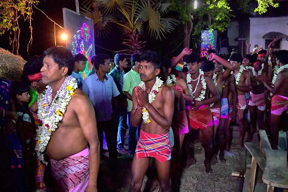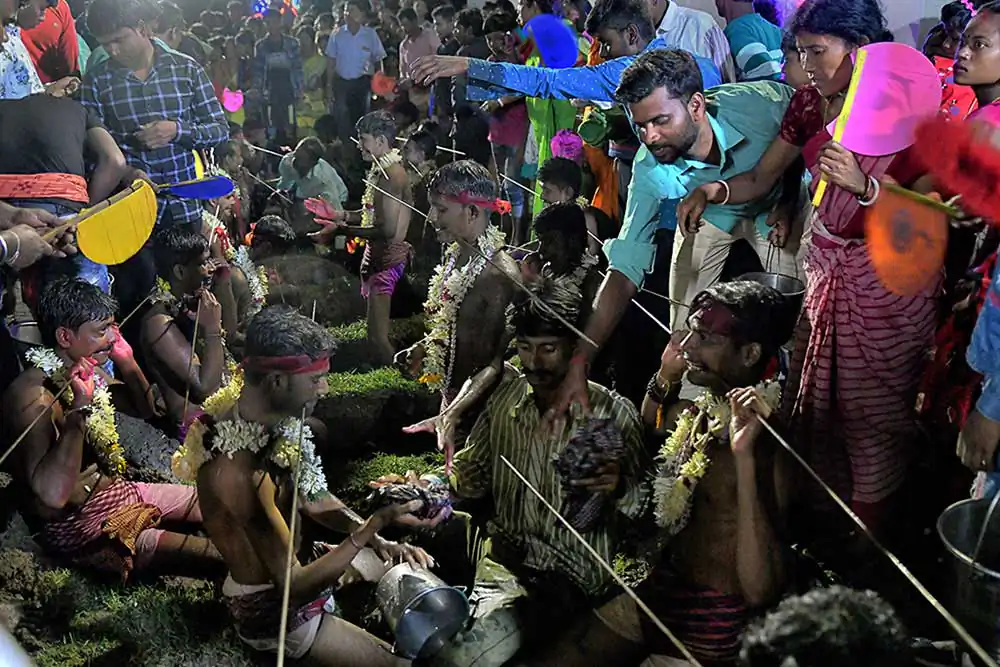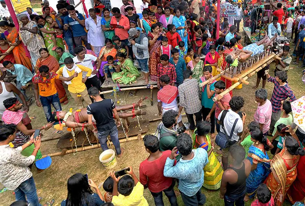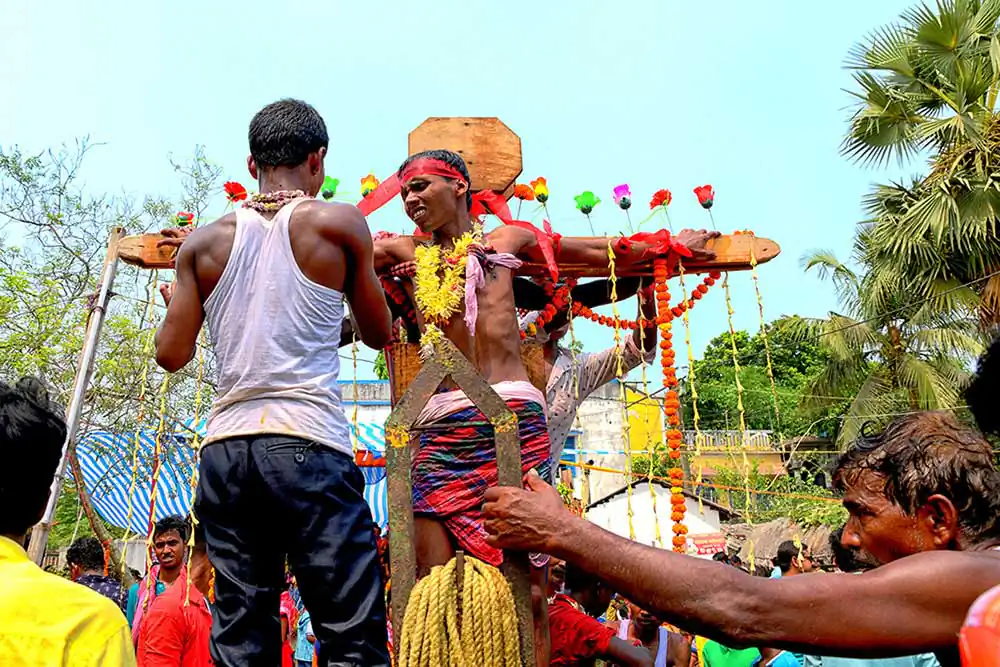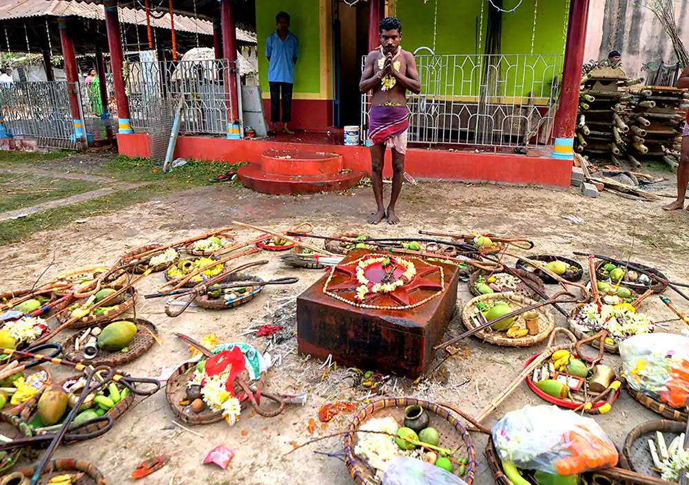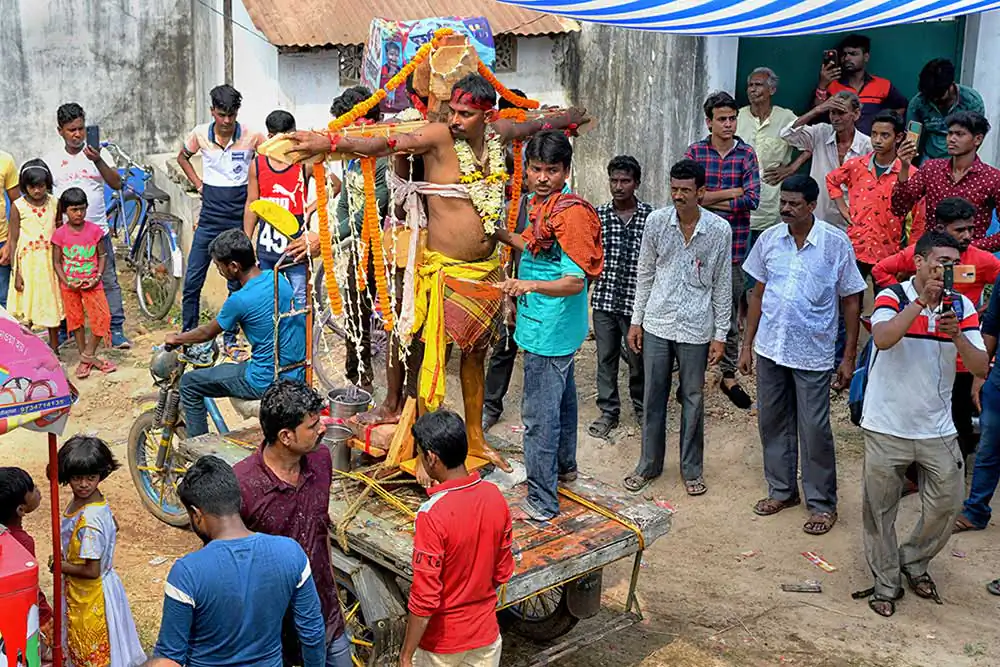 After morning rituals are over, there is a gap for about two hours. The preparation for crucifying rituals started at about 9 AM. Some devotees lay down on a wooden framework with large numbers of nails fixed on it. Some lay down on wooden frame having many sharp iron blades. Some experienced people are fixing nails on Sannasis body and tying them with a cloth to the wooden cross. This is called crucifixion. Sannasis, who are laid down on nail fixed wooden frame or crucified on wooden frame are taken on cycle van. As the cycle vans with ‘crucified’ persons start moving towards another temple, there is a huge commotion as village people runs with the procession. The vans and the devotees run in a circle and return back to the Shiva temple. All devotees pray to the Lord Shiva and the ritual is finished.