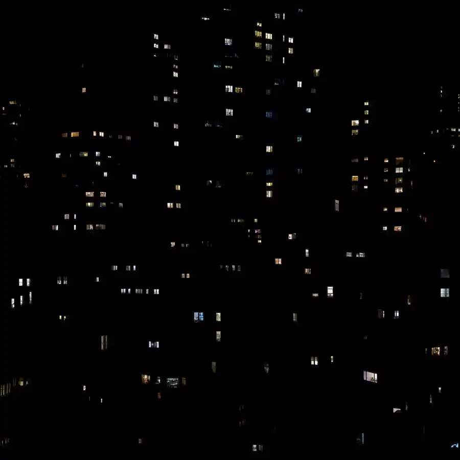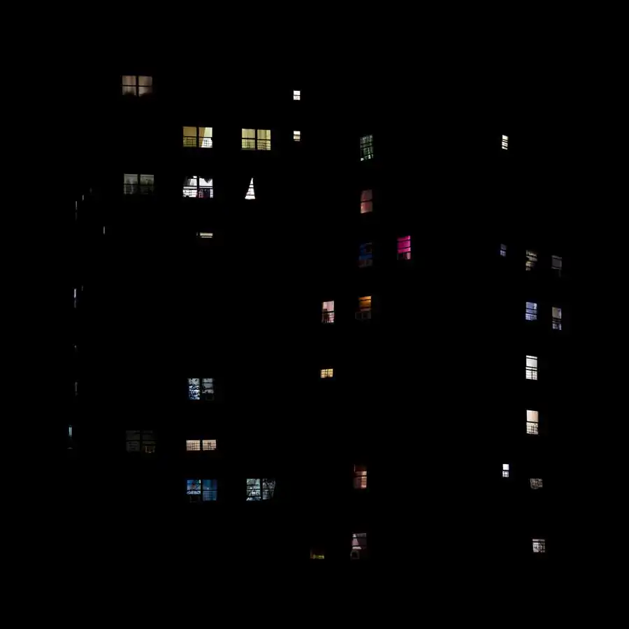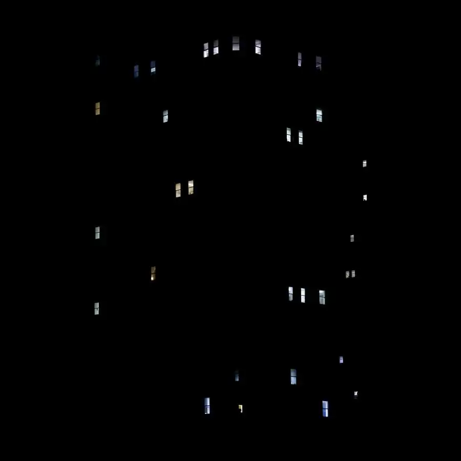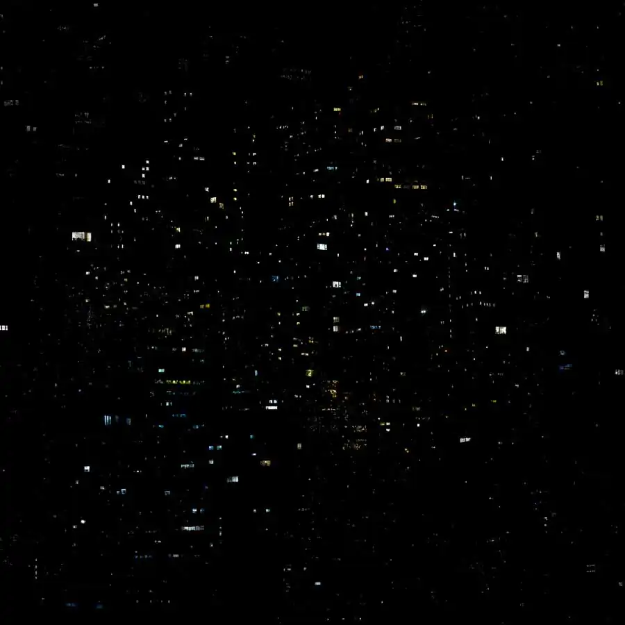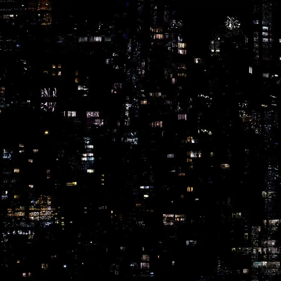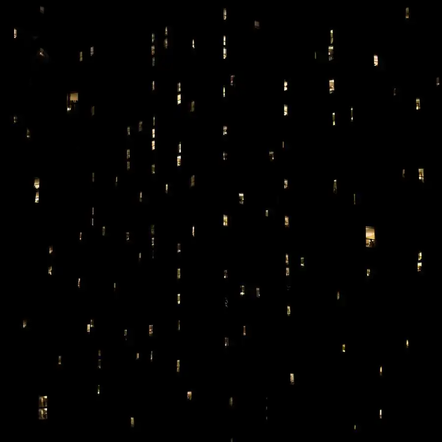 Building facades melt into darkness, their architectural details vanish, leaving only glowing windows in a sea of pitch black, like stars in the night sky.
