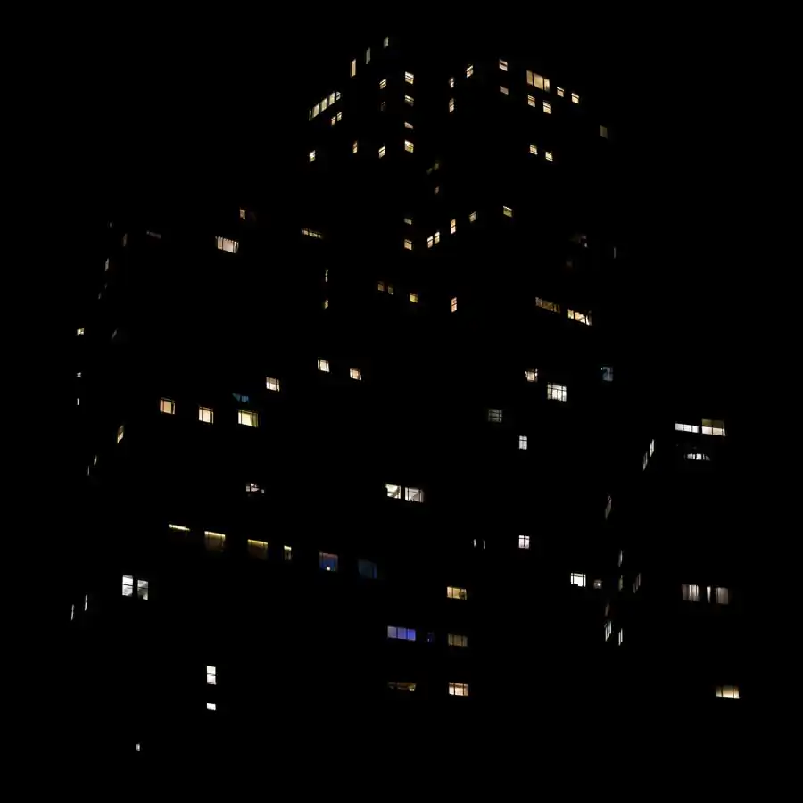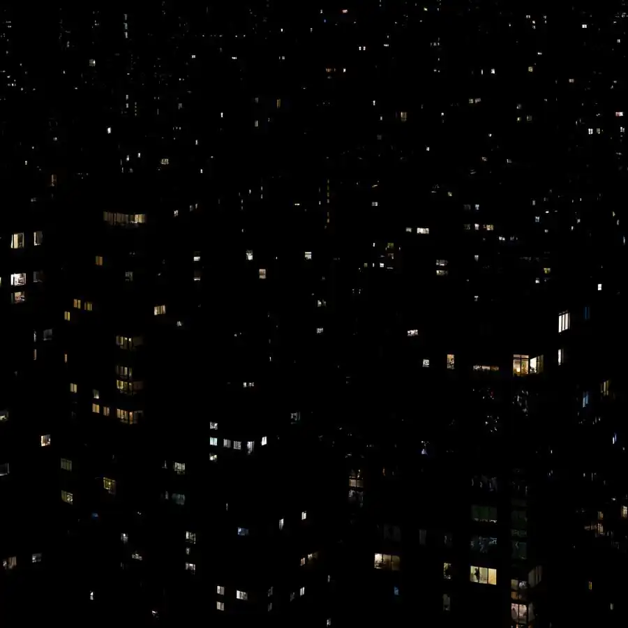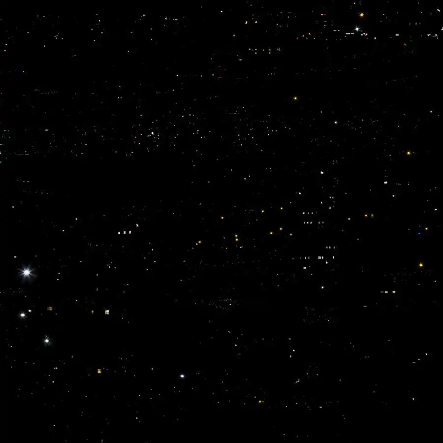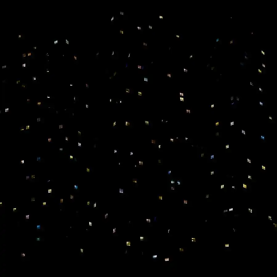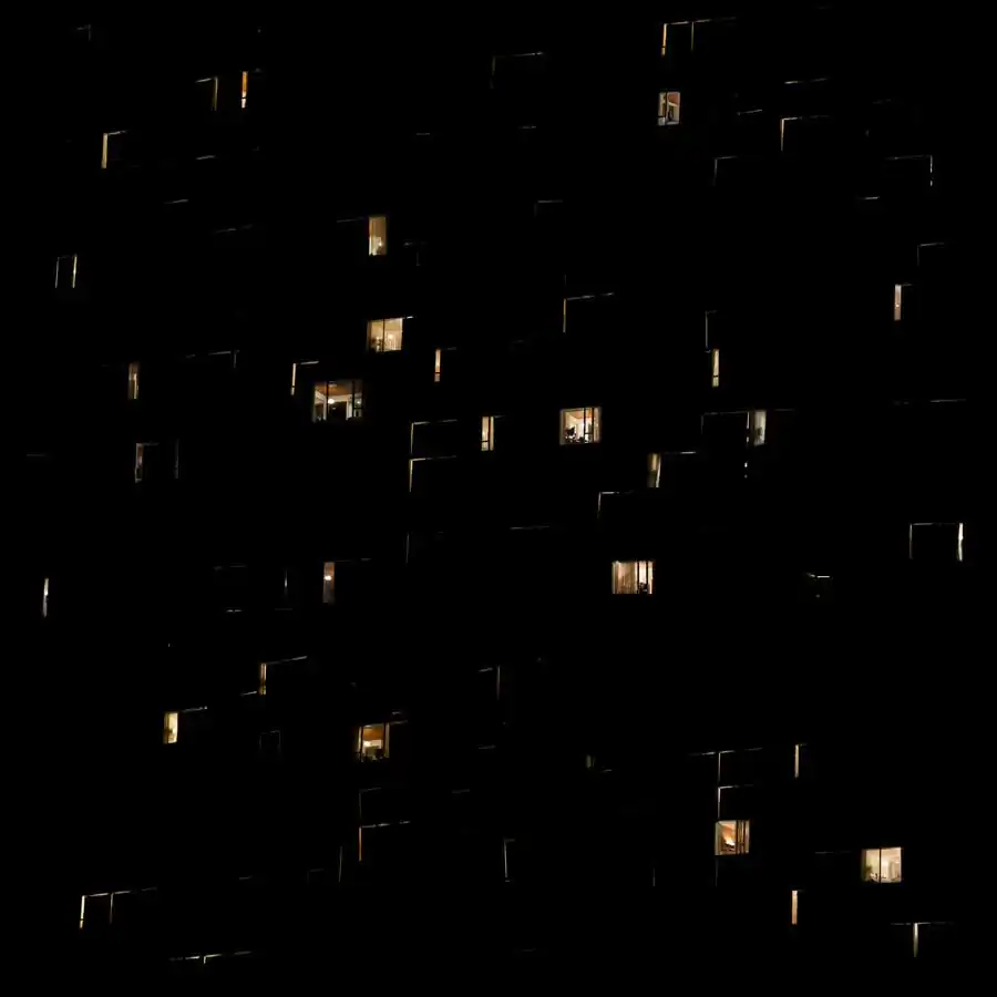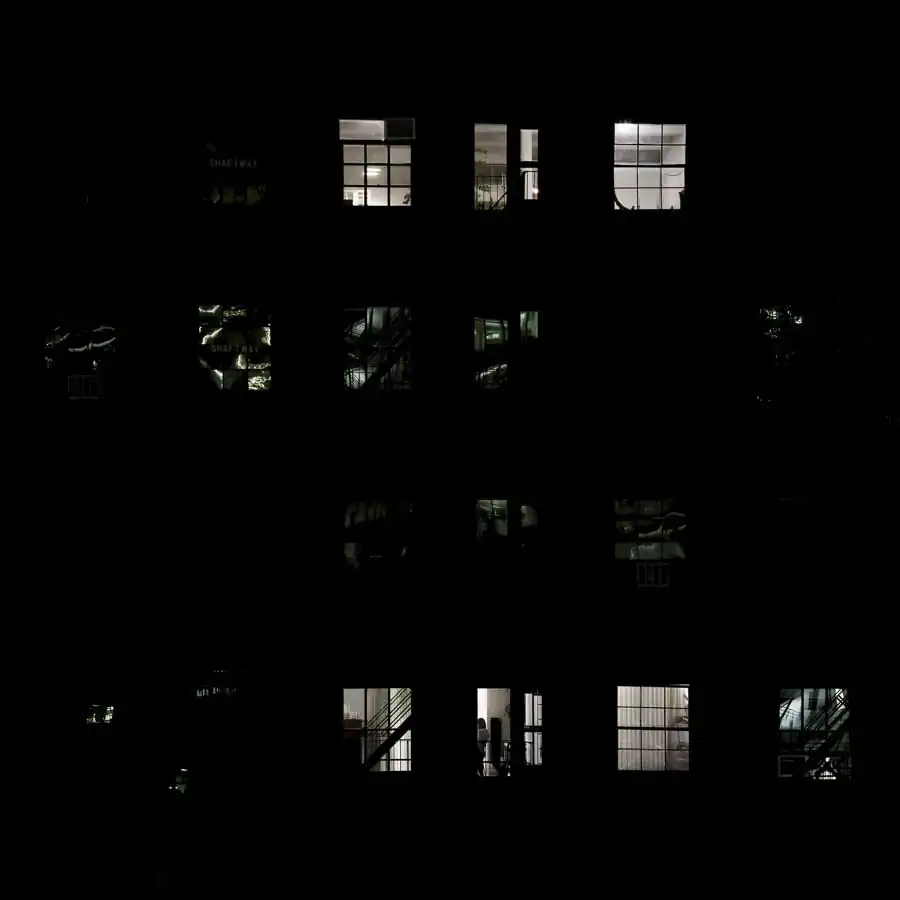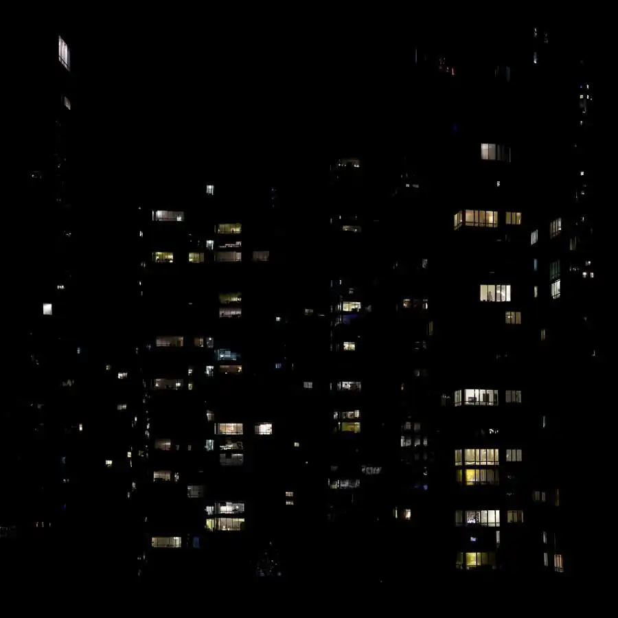 Building facades melt into darkness, their architectural details vanish, leaving only glowing windows in a sea of pitch black, like stars in the night sky.