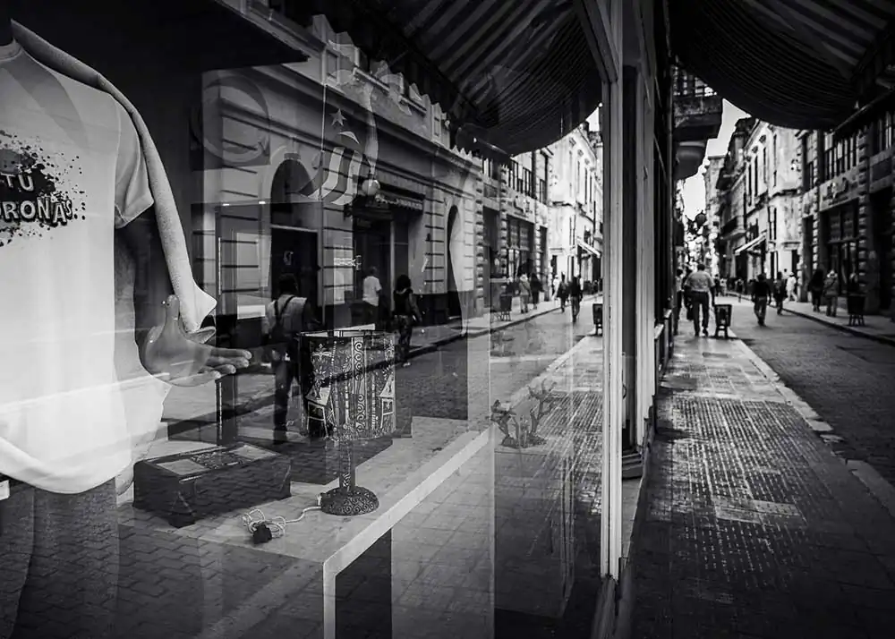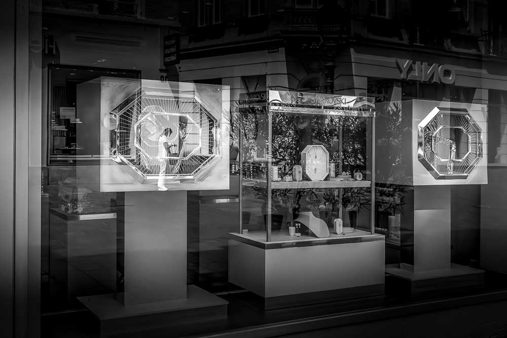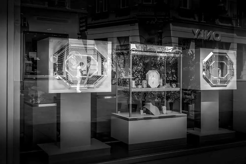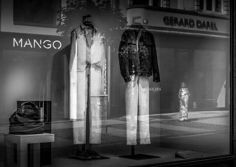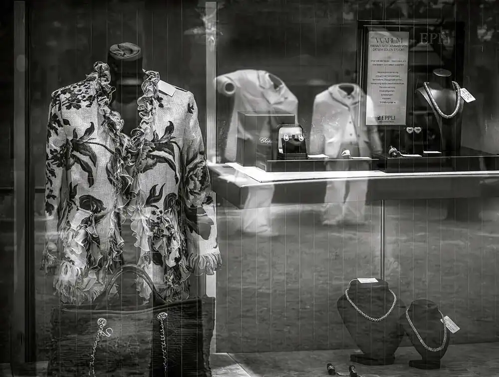 Each image in “Two Worlds” acts as a microcosm of urban life, a blend of ephemeral moments and enduring contrasts. The storefront mannequins and opulent displays become metaphorical players, whispering tales of desire and materialism against the backdrop of unembellished human realities. The reflections blur the boundaries between illusion and truth, encouraging viewers to uncover their interpretations of these layered worlds.