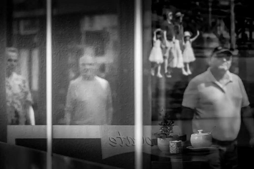Initially, I experimented with straightforward reflection images, multiple exposures, and composites. Yet, as I delved deeper, I discovered the unique potential of combining reflective surfaces with transparent imagery. This approach offered a profound way to comment on urban life. The reflections became more than mere optical phenomena; they transformed into windows—literal and metaphorical—that revealed the layered complexity of city environments.