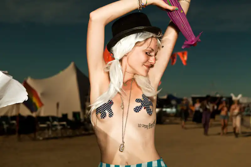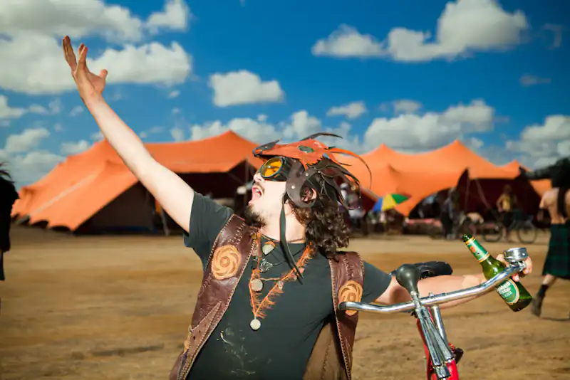 The photographs Shapiro shot that weekend are unlike his usualwork, which he captures by darting through festival crowds like a sneaky ninja. He usually takes on a very voyeuristic approach to catch the precious miniscule details and moments which emanate the essence of each individual festival. This time he had volunteer subjects posefor him in front of his unique set up, the results being something of beauty which could easily appear in an avant-garde fashion magazine. The images are sleek and crisp with bold bursting colours which contrast magnificently with theblue-grey cloudy backdrop.Shapiro explained “it’s about bringing fashion studio equipment to capture beauty and character while not just being another photographer, another voyeur, but becoming an art installation”.