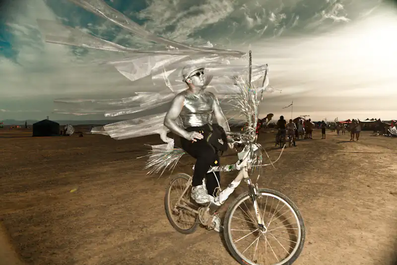 Half naked, body painted, umbrella wielding, bicycle riding, creative souls were motioned by curiosity and flocked to him like moths to a flame. He had masterfully enticed his subjects “into” his mobile photography studio and they were delighted to be there. His device, which he aptly named the “Walkingfashion Studio Rig”, lured his targets into his energy field and allowed him to shoot the madness which is Afrika Burns in a completely new light. Shapiro, inspired by the creative spirit of the event and two photographer, Soloksy and Schwabel, had this year managed to turn his passion for photographing festival goers into a performance piece itself which amused and amazed others.He said “I become one with Afrikaburn.”