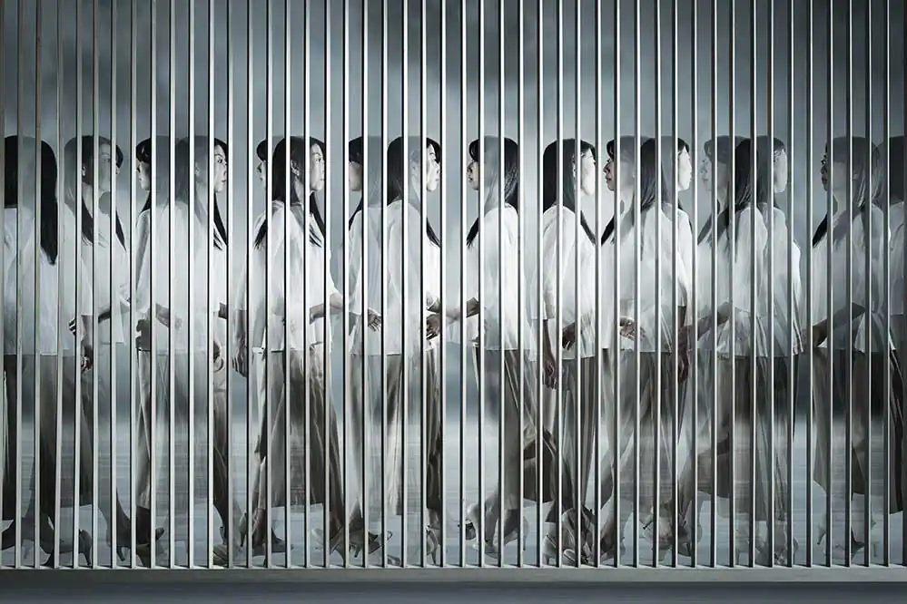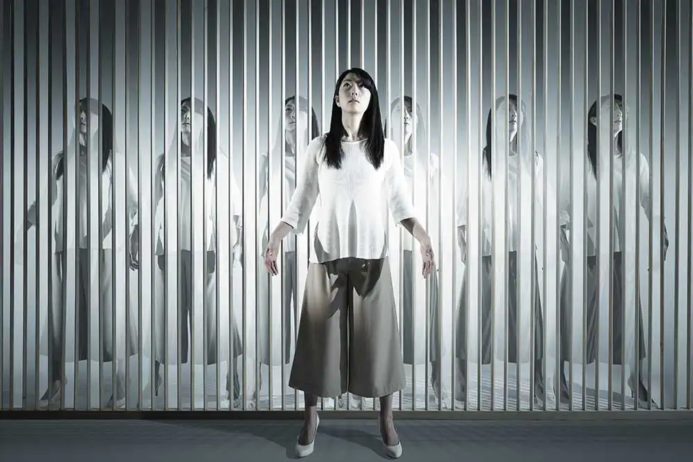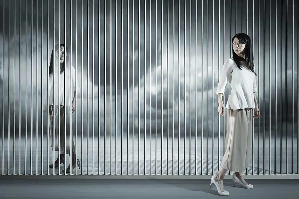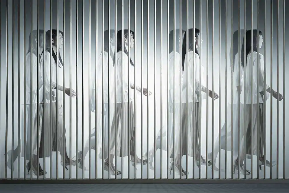 The fence panel is used as a border, a window or a doorway of the surfaces of the dimensions, and the people in the pictures are dealt as real existences and imaginary phantoms.