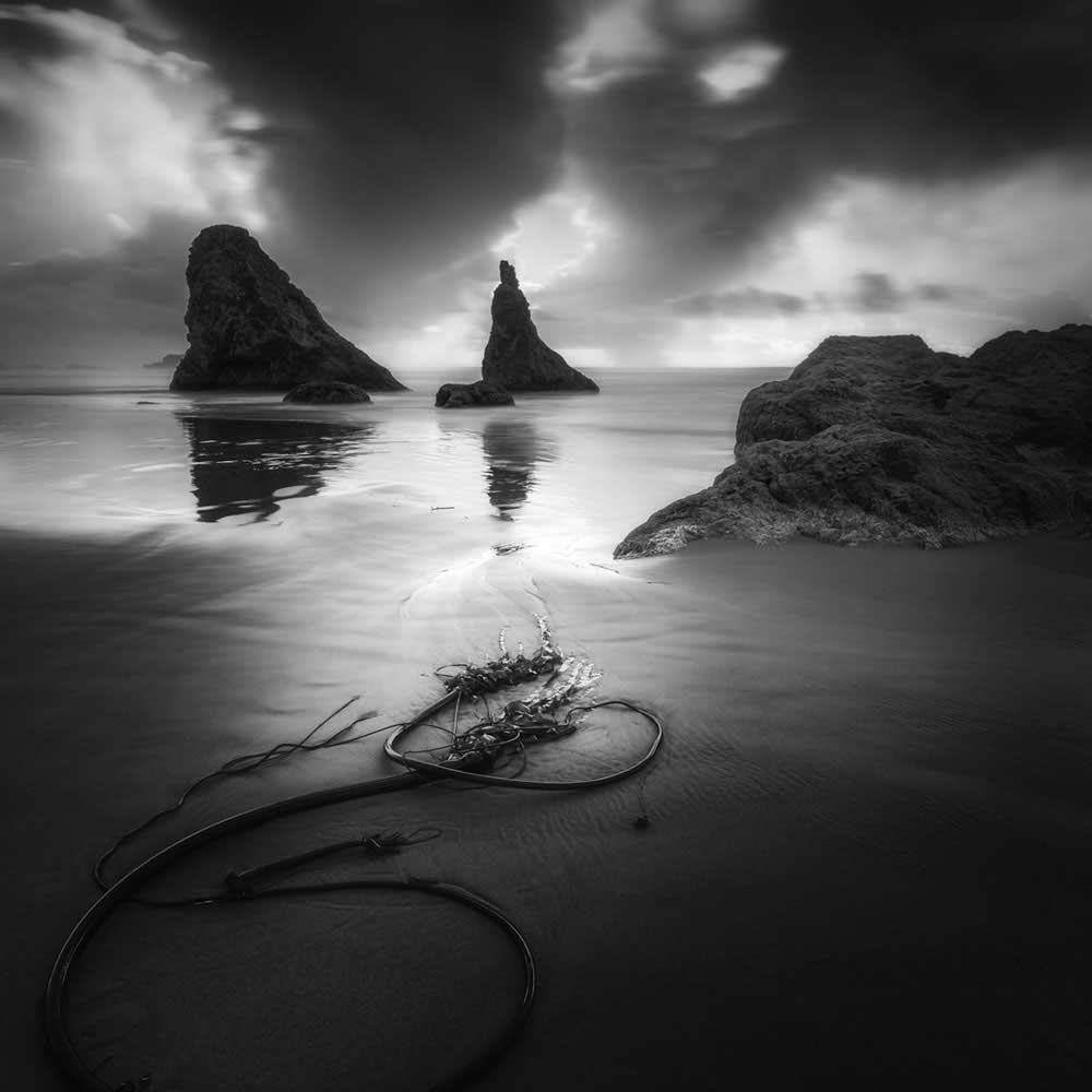 These strange and dramatic formations grow from sandy beaches. or raise like mountains from the ocean. They are the stone pyramids of time, continuously being washed by rain and carved by wind, and waves. Generated by volcanic activity, the monoliths are oftentimes surrounded by fog, in a mysterious, dramatic, and otherworldly atmosphere. This set of images are part of a larger project imagined in white and black, as this was the most expressive way of re-creating these unique landscapes.