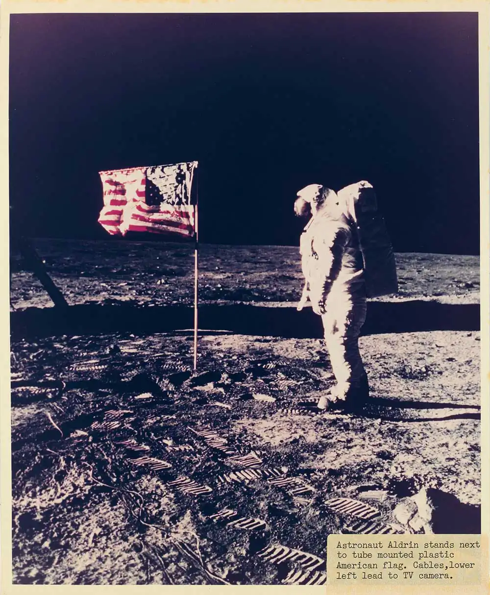 The auction also includes an archive of six binders containing approximately 280 photographs depicting Apollo Missions 10, 11, 12, 13, 15, 16, and 17, from launch to splashdown. Featured are many iconic views of the historic Apollo 11 mission, showing Buzz Aldrin and Neil Armstrong setting foot on the Moon for the first time, the memorable images of the plastic American flag, and Armstrong’s reflection in Aldrin’s helmet visor. Also included are multiple views of Earth as seen from outer space, and various photographs of astronauts performing scientific experiments on the Moon’s surface. There are 84 silver and 199 chromogenic prints in the binders, ranging in size from 4 x 5 ins to 8 x 8 ins and 8 x 10 ins. Some have captions affixed to recto, while many have notations on verso, in pencil and ink; also present are a number of reproductions after photographs as well as Apollo related-ephemera in the form of decals, plaques, and letters, all dated 1969-72.