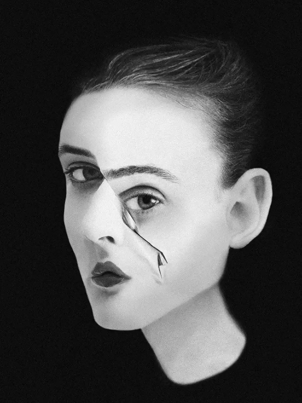 The work aims at blurring the line between classical portrait photography and fashion photography, to place the human body at the heart of the picture.It provides a bird’s eye view of the physical and psychological fragility of the human being, illustrating the gap between people’s self-expression and the way they perceive themselves. Other recurrent themes include the exploration of the public and private spheres and the social role of woman. Thanks to an analog manipulation, combined with varied techniques developed by the artist, the digital photographs of the series undergo careful disorders which render the psychological turmoil. [Official Website]