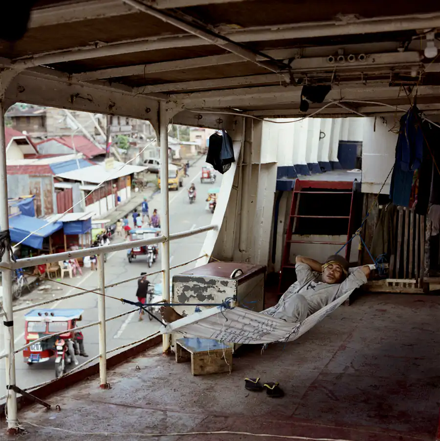 Judel Suberon (23), a licensed security guard works for M/V Gayle, a cargo ship carrying 25,000 bags of cement waiting to be removed from the land back to sea. January 5, 2014. Barangay Anibong, Tacloban.
