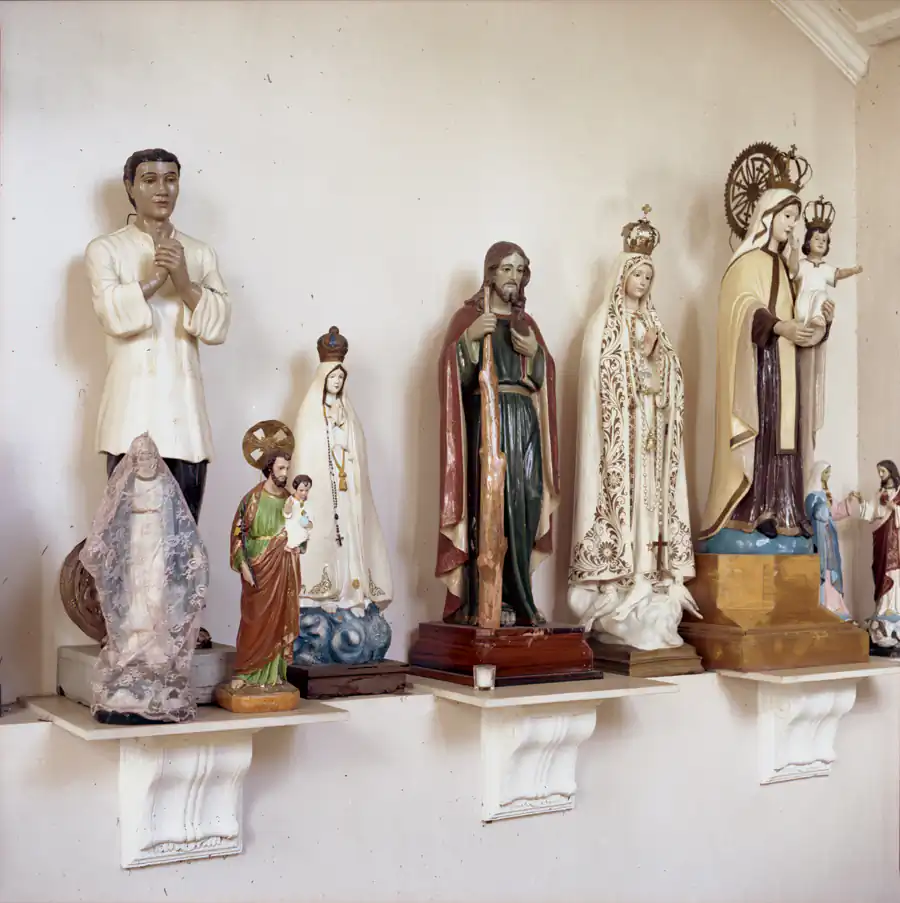 Religious relics are safely placed at the back of the Cathedral of the Transfiguration of Our Lord in Palo. with a statue of San Lorenzo Luiz, a Filipino saint on the left. January 6, 2014