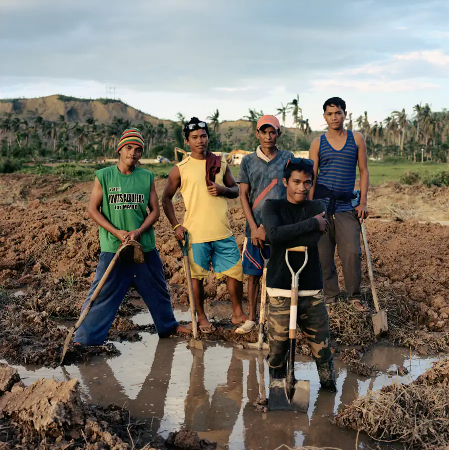 Junel (21), Mark (19), Arnold (44), Jeron (21), (left to right) and Rolando (19), (front) work in a mass grave site located in the Holy Cross Memorial Garden, Barangay Diit. One hundered forty six identified bodies are buried in this site. January 6. 2014.