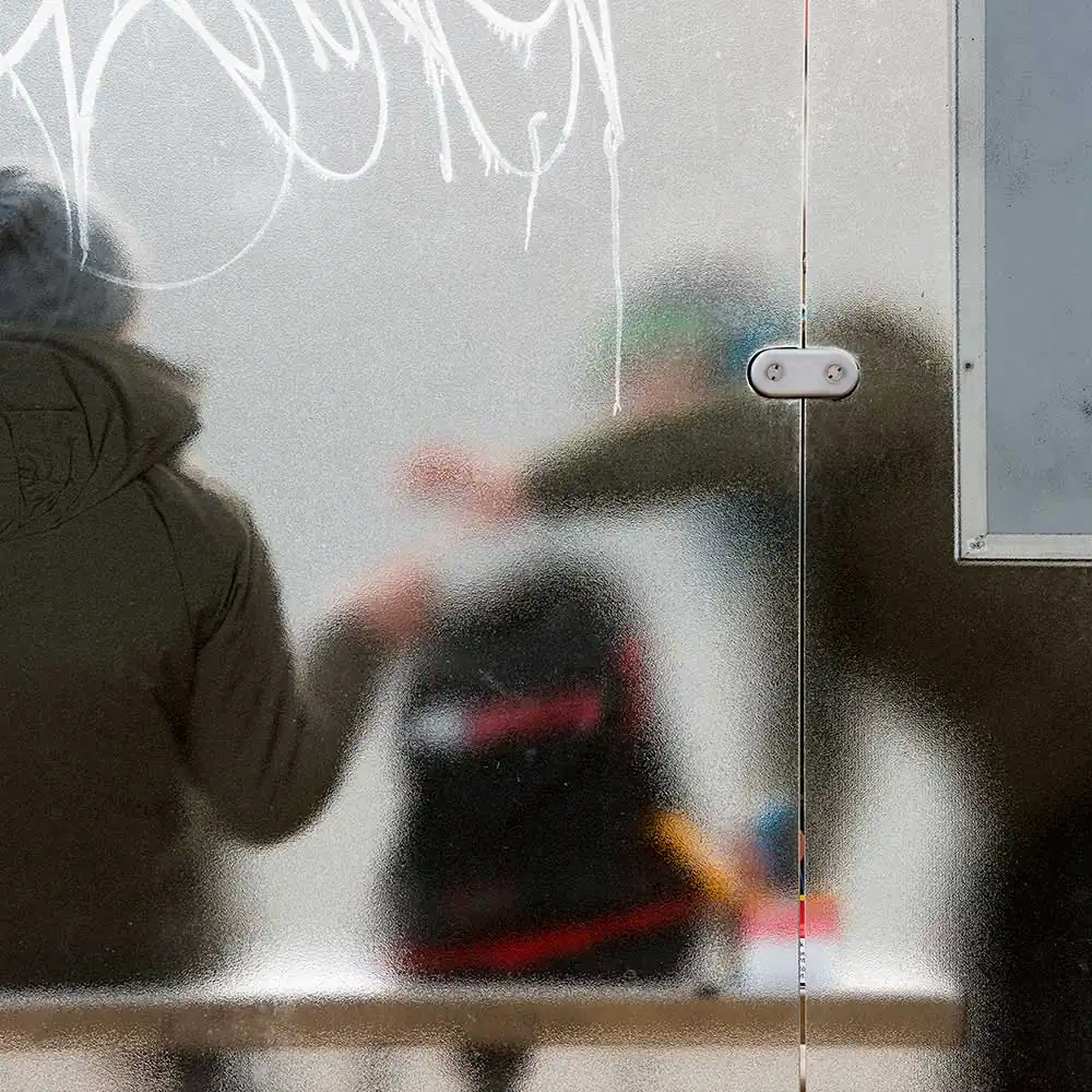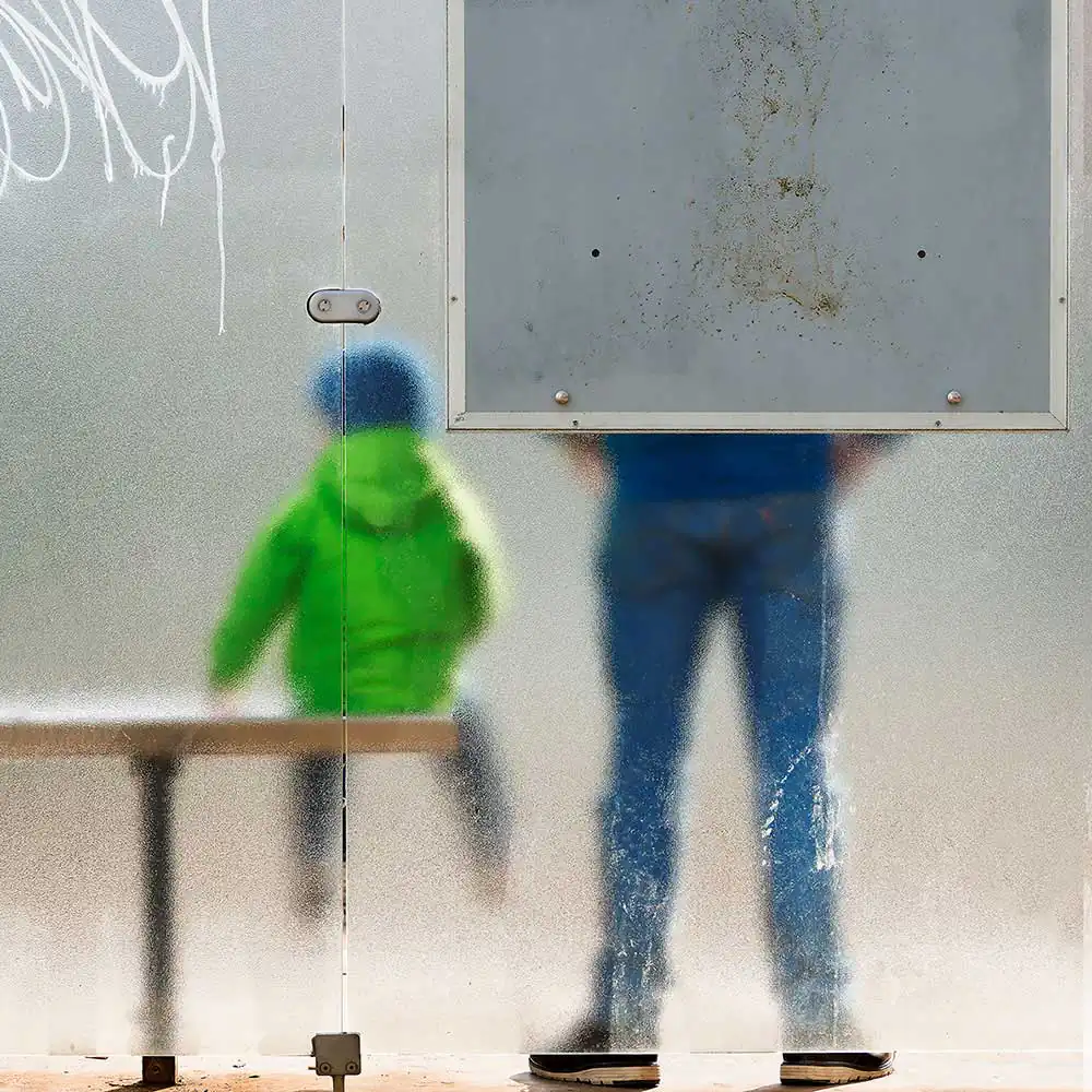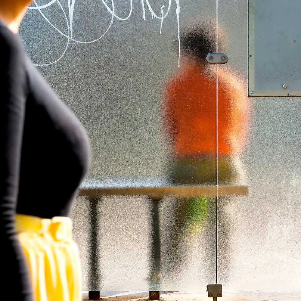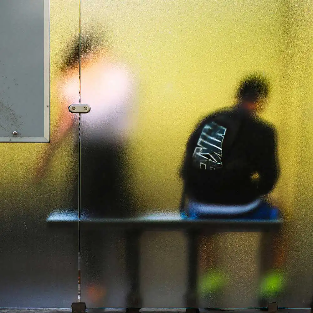 For the observer, everything happens behind an opalescent glazed partition. It is like a window onto another world. The photographer captures a slice of life from which he is excluded.