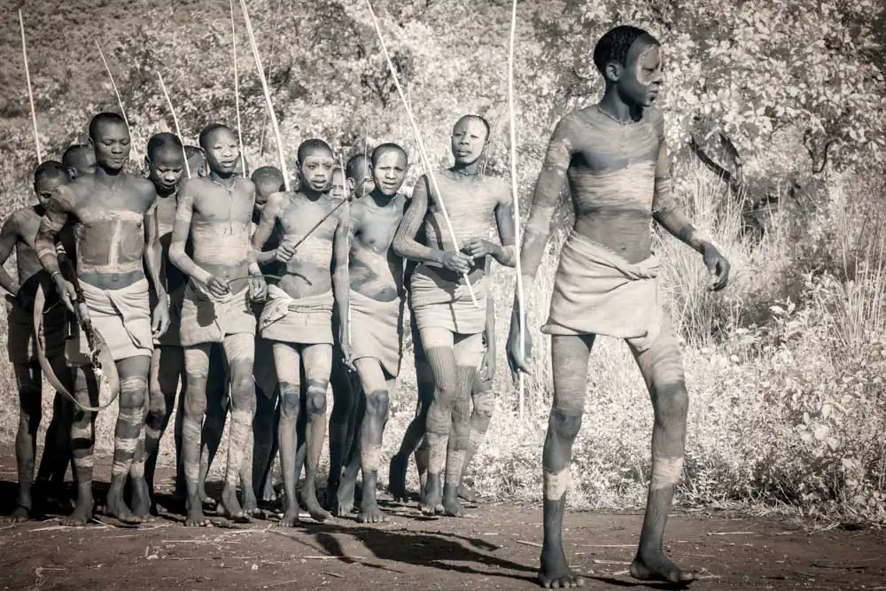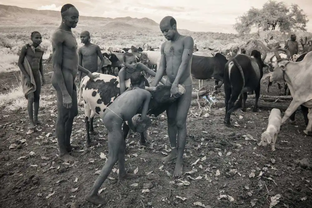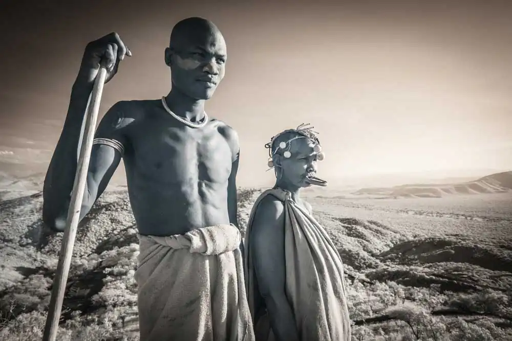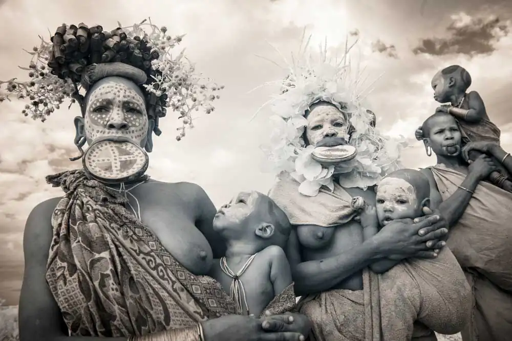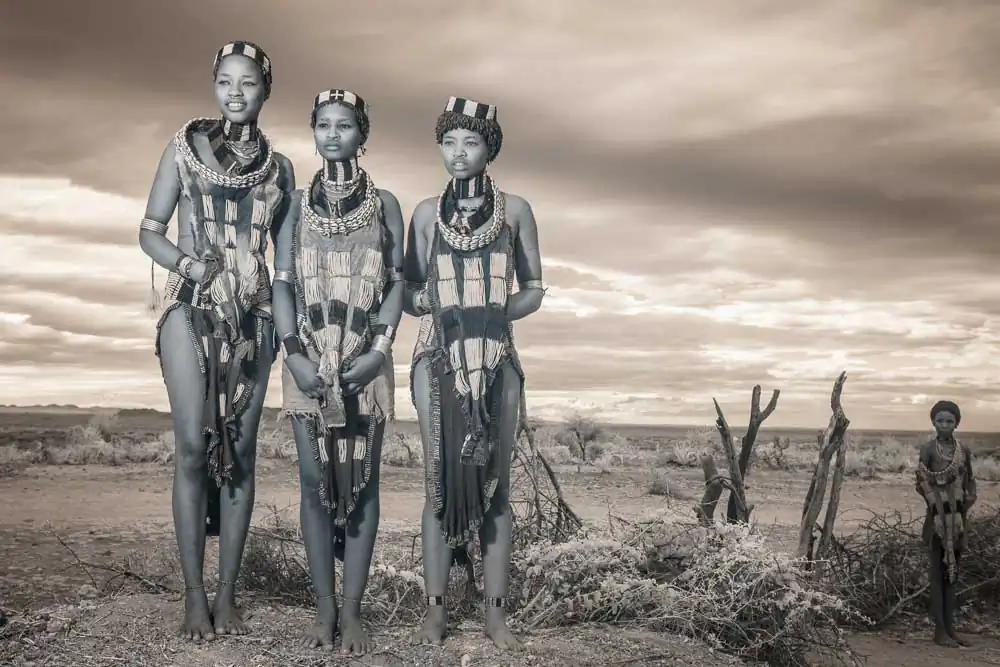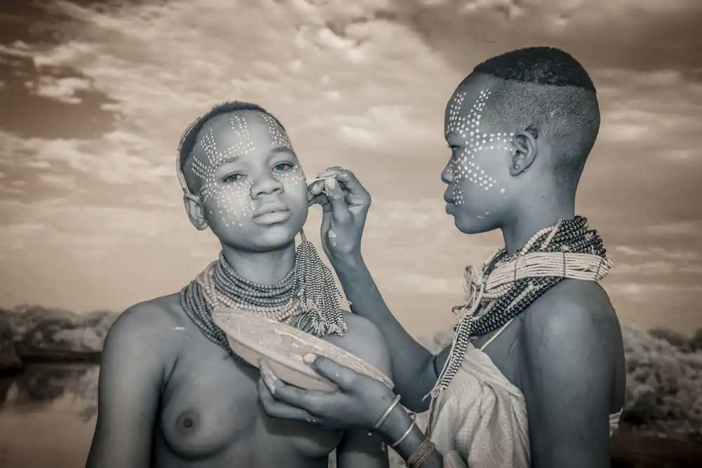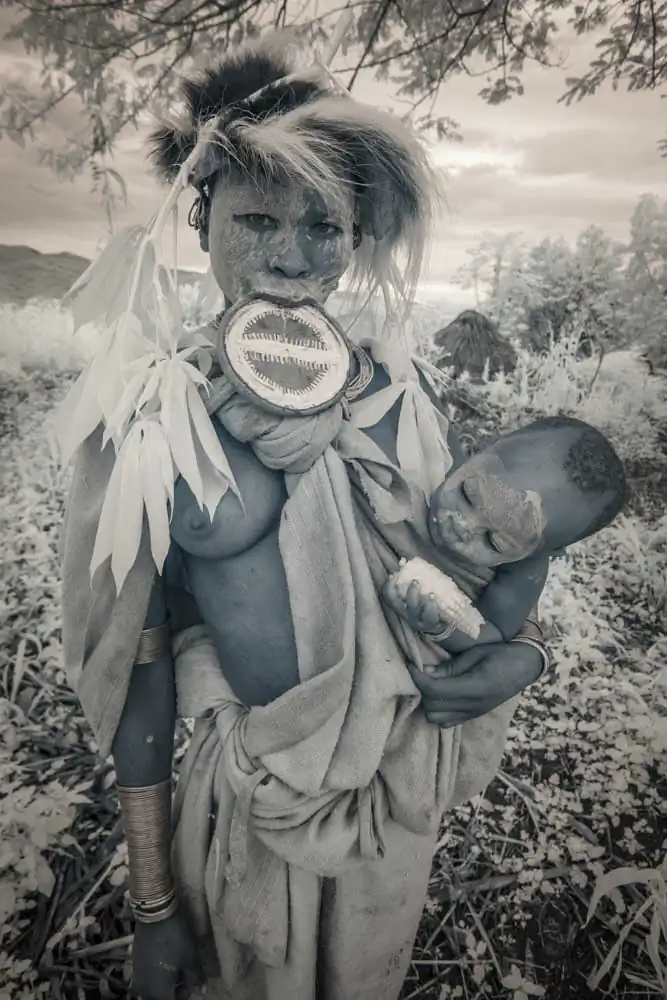 In recent years, Gold has visited a number of tribes throughout Asia and Africa. The Omo Valley of the East African savannah is an ancient land of mystery regarded as the birthplace of all human kind. It is home to the Surma, Kara, Hamar, Dassanech and Mursi tribes who live in complete symbiosis with nature, daily adorning their bodies with natural materials from the world around them. Beautification and scarification practices equally beautiful and brutal are encouraged as a way for an individual to establish their identity within the community.