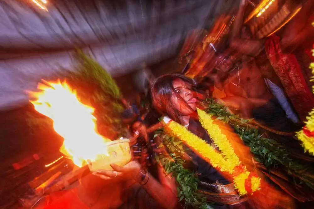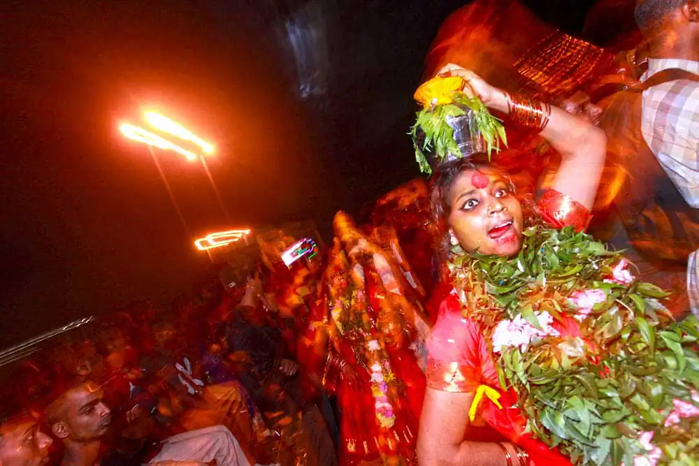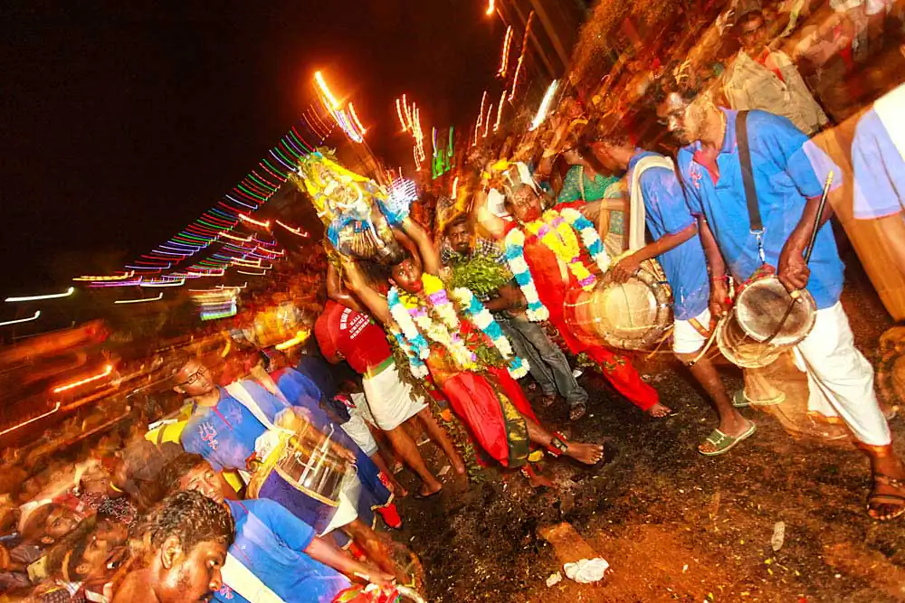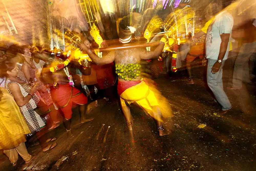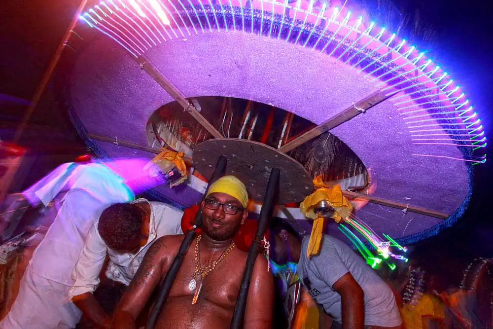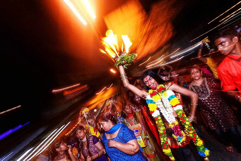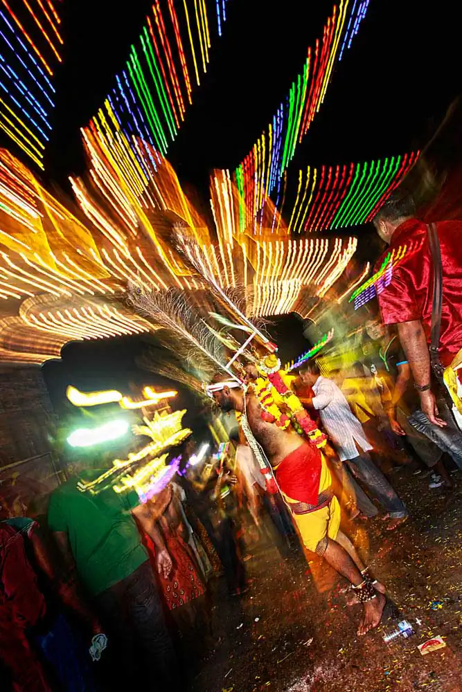 While shooting the same experience can become a task, Visithra began looking at different ways to shoot the festival. One of the things she wanted to showcase was the dancing and music that takes place with every kavadi so she used light and slow shutter photography to express the exhilarating music and passion of the devotees.