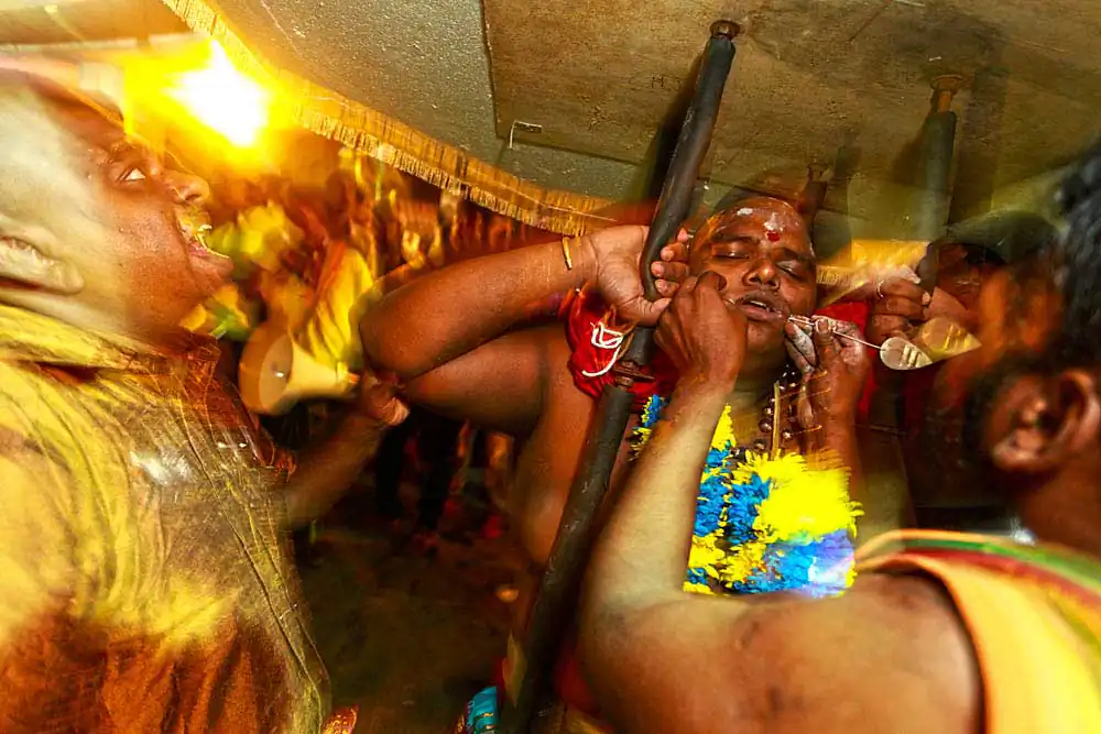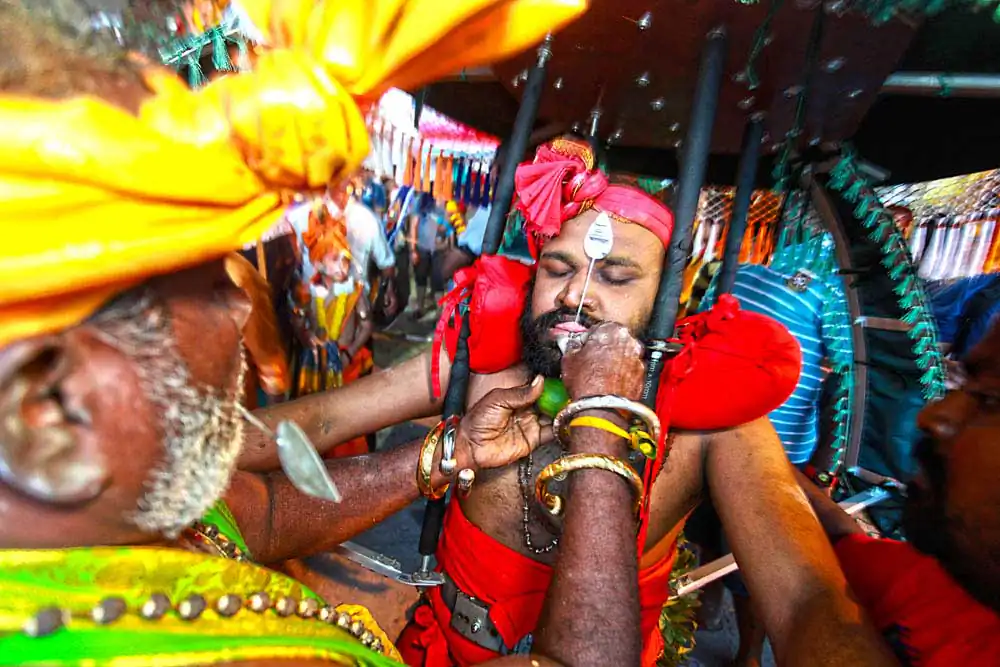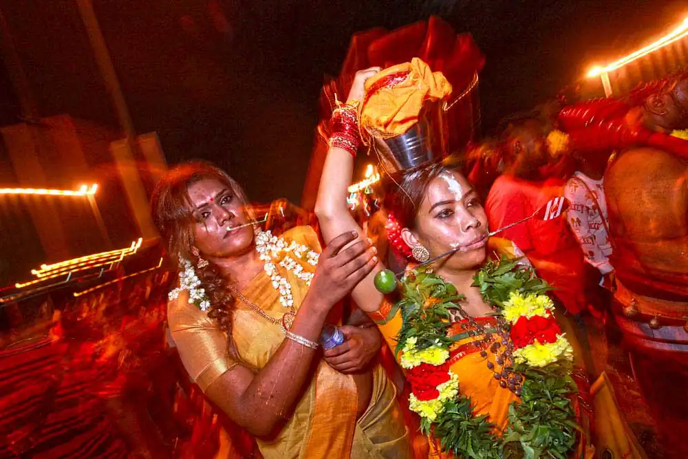 Thaipusam is celebrated in honour of the Hindu god, Muruga. Weeks before the festival starts, devotees fast and practice self-restraint as they prepare to carry the Kavadi. The kavadi is a decorated structure containing pots of milk, often 3-4 feet in height, weighing more than 7 kg. On the day of the festival, the bearers head to the river for a dip before they are pierced while under a trance with hooks and spears in the form of the vel (weapon of choice of Lord Muruga).
