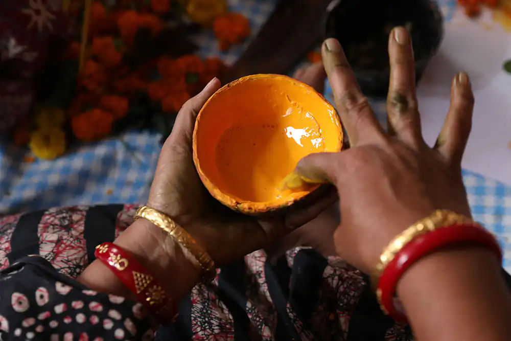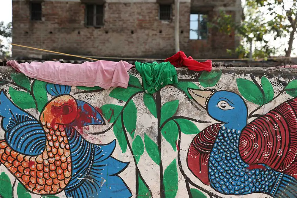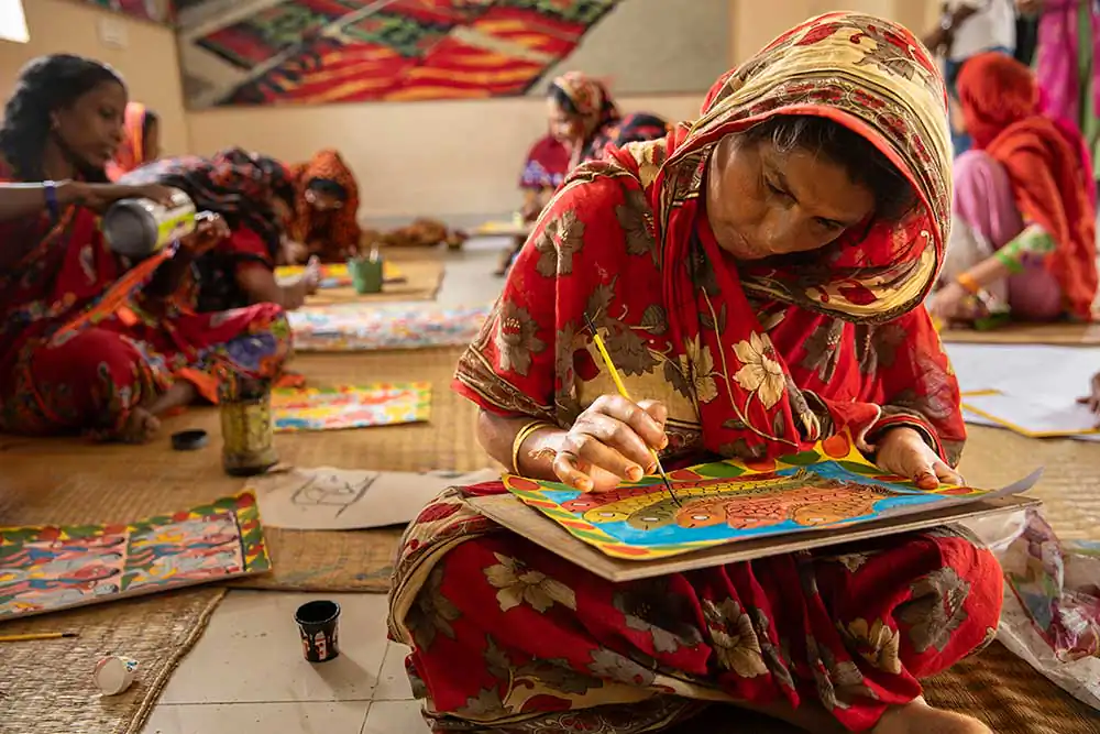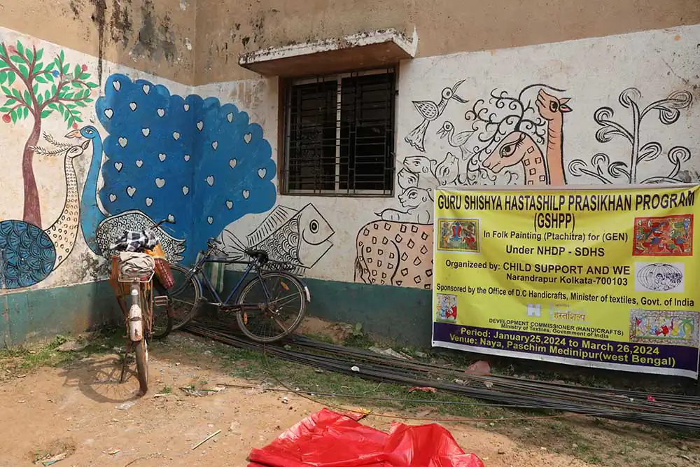 The Chitrakar women accompany the slow unrolling of these panels with songs that narrate their contents. The stories they tell have evolved: alongside classic themes recounting the myths of Hindu deities or aspects of nature, we now find scrolls that address political and contemporary issues, such as the September 11 attack on the World Trade Center, the sinking of the Titanic, the tsunami tragedy, the Covid-19 pandemic as experienced by the female community, and even issues related to violence against women.