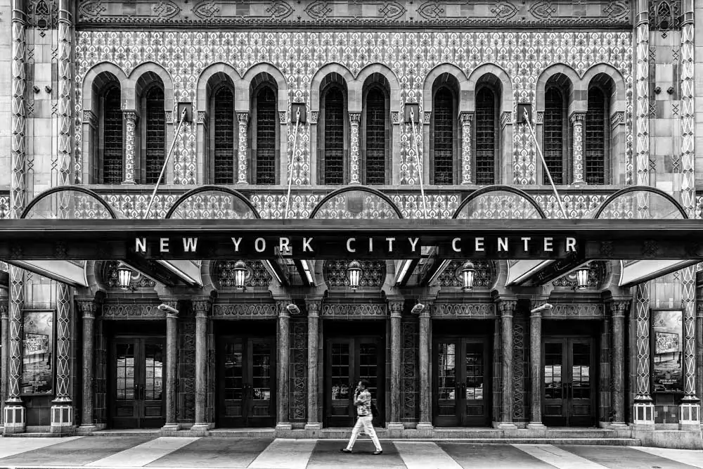 It was a cloudy day on July 15, 2016: New York City Center has existed for centuries on Broadway only a few blocks from Times Square. It is Manhattan’s first performing arts center and is built in a Neo-Moorish style. Ten Islamic arches shape the front doors accented by ten pillars and ten windows. The gray brick stripes the street like a timeline. Edi Chen stood opposite this facade and set up my camera, at that very moment a woman was walking and talking on the phone right into her picture. She waited until she was positioned in the middle of the door and pressed the shutter. This is one of her many