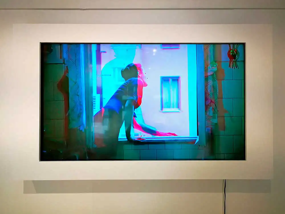 In the video work “Picnolepsy”, a character is placed in a spatial dimension that’s made ambiguous by an immersive context of anaglyphic vision and 360-degrees audio: the distorted stereoscopy, arising from the repetition of the same action and from the filming of the two shots from slightly out of sync points of view, is meant to put into practice an acute reflection on the boundary between truth and fiction, between the real, its knowledge, that’s influenced by learned, inherited mechanisms, and its continuous reconstruction and modification as a projection towards the outside world. Various visual and auditory expedients aim to involve the viewer in an uncertain sensorial circumstance, but they are also used to enlarge the setting to a wider situation (sounds which tell the presence of a second person on the scene, the two silhouettes of the actress, which sometimes separate and split, thus allowing us, through the unveiling of the the trick of film simulation, to see what would not be normally possible).