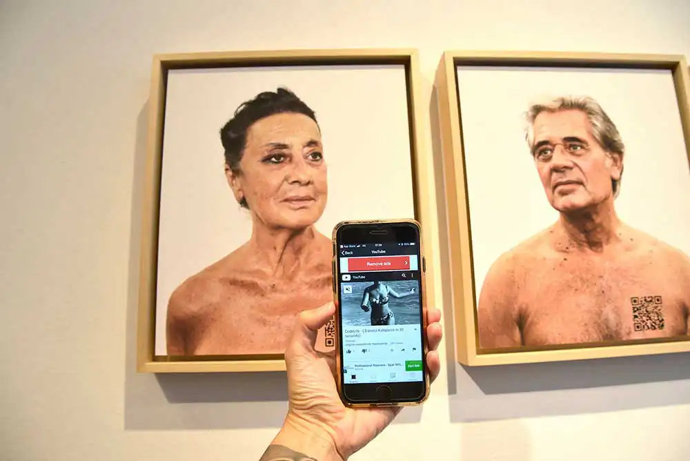 Virginia Monteverde (1969, lives and works in Genova, Italy) directs her artistic choices towards digital mediums, by experimenting their peculiar expressive potential through video art, photography, multimedia installation and digital painting: in this fluid era of globalization, media communication and rapid technological changes, the artist adapts her expressive means to the current habits of use and reading of messages, with the intention to establish a direct and deep interaction with the viewer, starting from a level of a fine- tuned structuring to then reach a subsequent emotional one. Her works, characterized by essentiality, order and rationality of classical derivation, convey reflections on the individual and collective plots of a society in upheaval and radical mutation, of which the artist wants to transmit the new liquid perceptions. In the series “CodeLife, The Artists”, the nudity of the body, the expression of the subjects, the surface of each person’s epidermis are protagonist, in a gallery of half-bust figures where the portrait tradition is renewed into a contemporary version: added to the effigy of the person, captured in a given instant of time, in the here and now of the moment of the photo shoot, is the temporal dimension of the past, of the personal experience, of the story of each of the subjects, contained within the 30 seconds of a video of which the link to access is encoded in the QRCode that everyone exposes “tattooed” on the chest, at the height of heart, as a numerical seal to decipher, able to enclose a plurality of data, in this case the same ones deposited, marked and layered on the skin of each individual, as a kind of not immediately accessible writing, traced by the passing of years and experiences. The fast flow of moments of life from childhood to the instant of the pose in front of the artist who portrays them “lays bare” the six artists and offers thirty impressions of insight almost “stolen” from the intimate memory of each; every shot in turn seems to take on the value of a new code that mysteriously then generates the following temporal fragment, as a sort of “Chinese boxes” configuration in the inscrutable unknown of the unravelling of existence. The speed of the frames in the video creates a parallel both with the extreme rapidity of information diffusion in the modern world and with the suddenness of the associations of the mind; the gaze is key and leads to the unfathomable abyss of the individual, a precious vital cipher that is transmitted to us in this “trailer” of the life of each of the protagonists.