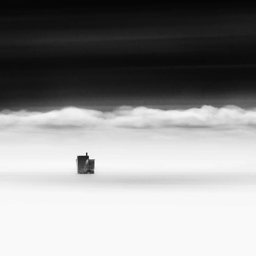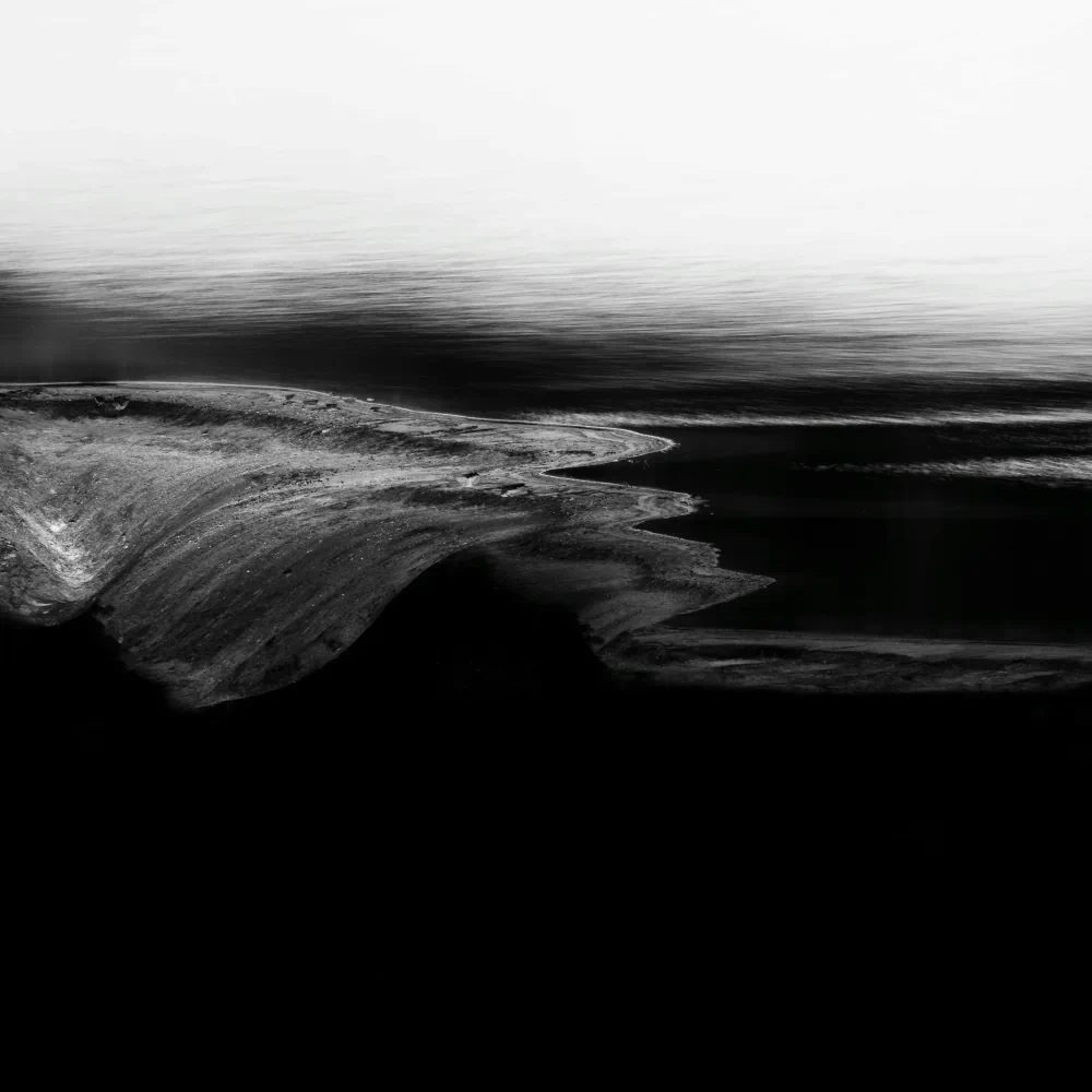 In several images, isolated elements emerge from the reduced landscape: a fragment of rock, a floating form, a faintly drawn shoreline. These minimal presences are intentional. They introduce a quiet tension, something to hold onto without dominating the frame. Although one human figure appears in the photographs, the sense of human presence is not entirely absent. On the contrary, it exists through omission. The absence of the body allows the landscape to function as an emotional stand-in, a space where personal experience can be projected.