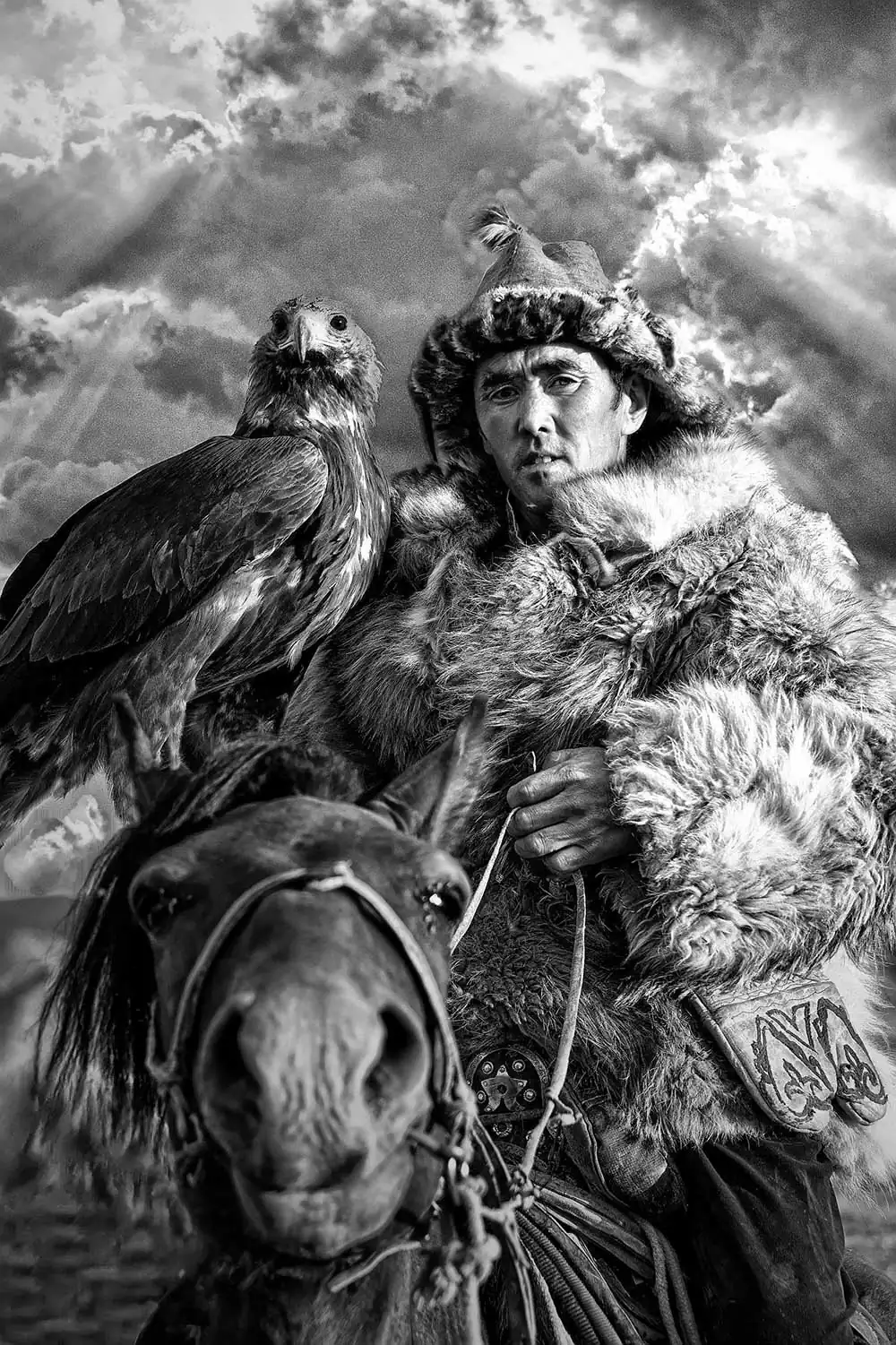 In Western Mongolia, the Kazakh eagle hunters stand as proud custodians of a centuries-old tradition, steeped in bravery and kinship with nature. Each portrait captures the weathered faces of these skilled hunters, etched with lines that narrate stories of resilience and courage. With eyes that mirror the wisdom of generations, they evoke a sense of reverence for the bond they share with their majestic golden eagles.