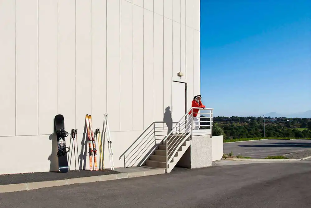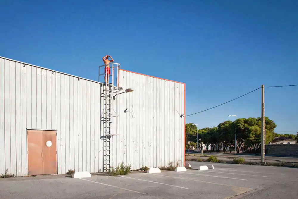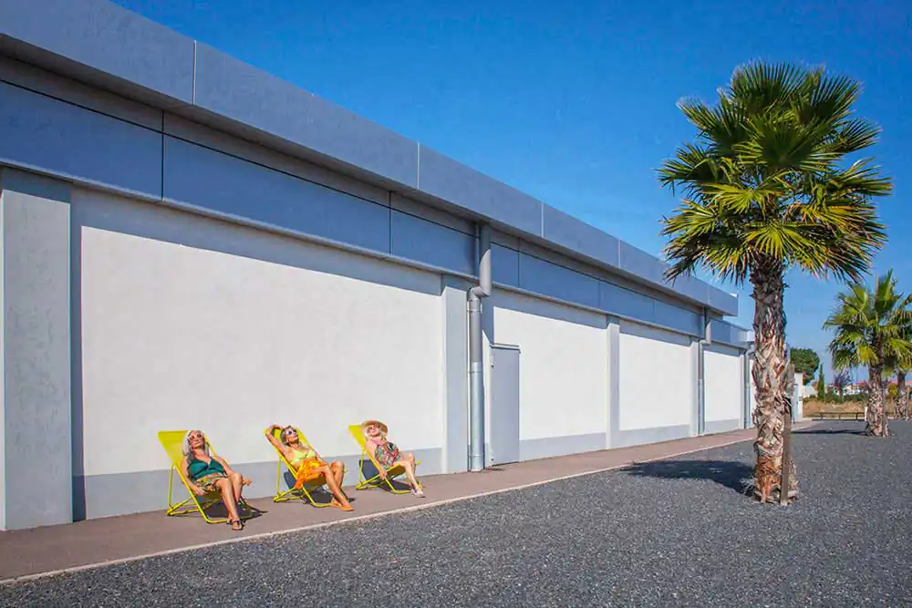 The project “The center of spare-time activities” stages models playing the role of tourists in a chosen scenery : commercial areas in suburban zones. It illustrates the current m utation of m alls, especially in France, through absurd and derision.