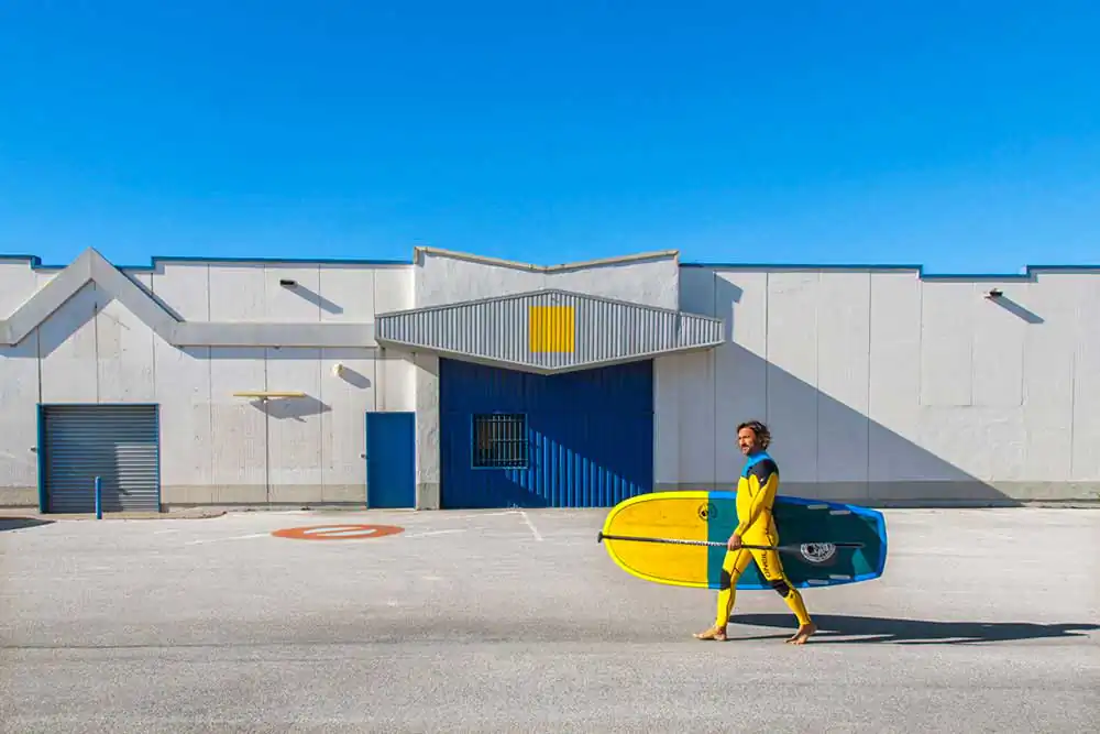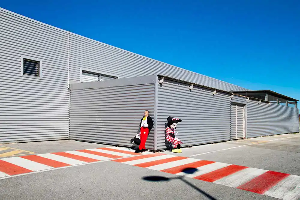 The project “The center of spare-time activities” stages models playing the role of tourists in a chosen scenery : commercial areas in suburban zones.
