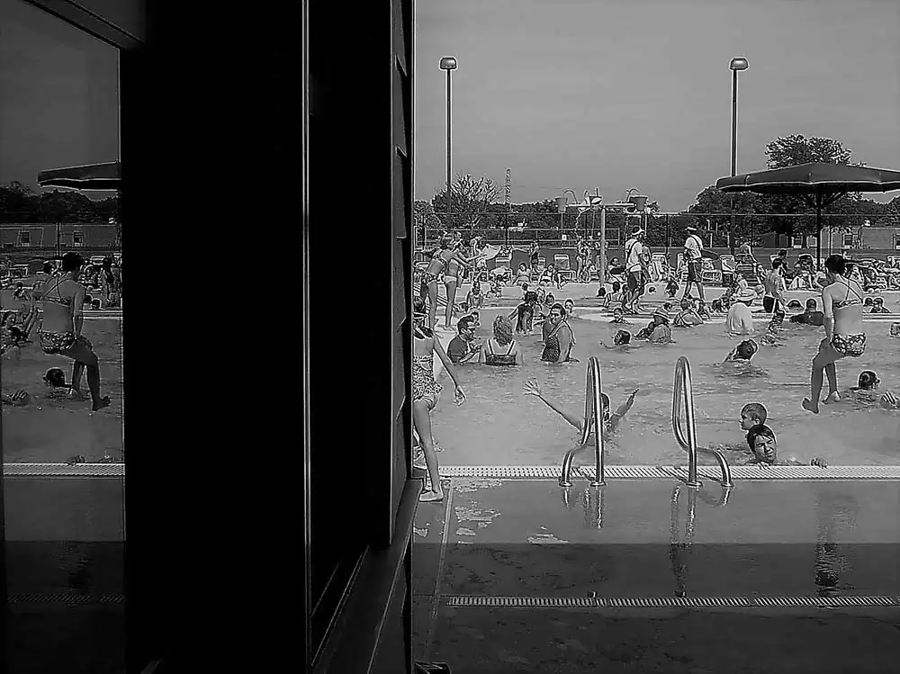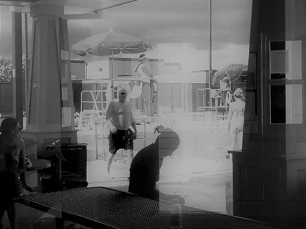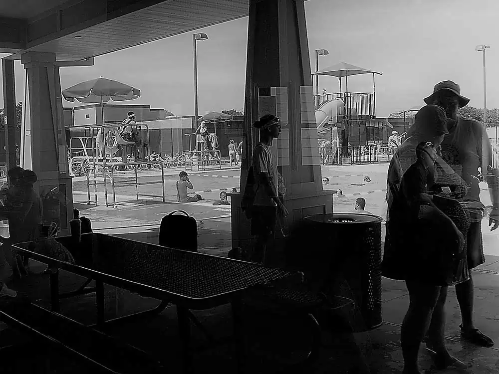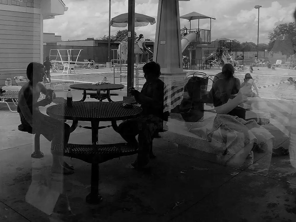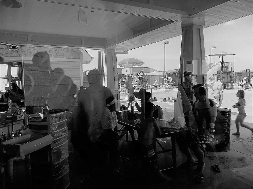 I confess, I am a painter at heart – and, the principles of painting dictate my photography, as the latter does derive its template from the prior. I happen to be at the Chippewa pool twice with my boys. My objective was to study the light and its effect on a small space thick with people. I chose a camera that allowed a small amount, with low resolution. Intention? To occlude light, to derive the occlusion aesthetic in stasis, as well as movement of the bodies in the small waiting area with only one office window in harsh mid-day light – without any sort of definition of their intent. The result is a collection of low resolution palimpsests of people in various activities in their social construct: the swimming pool and its club house.