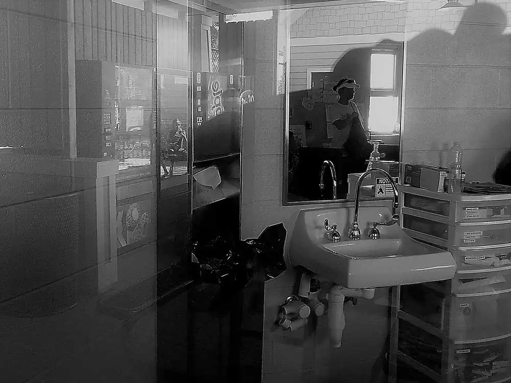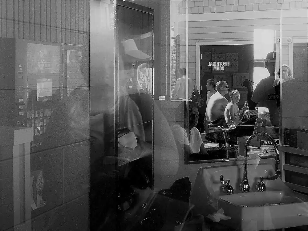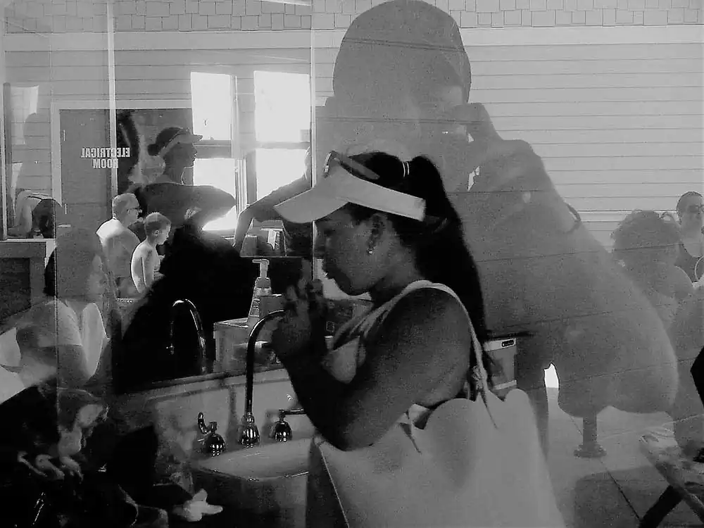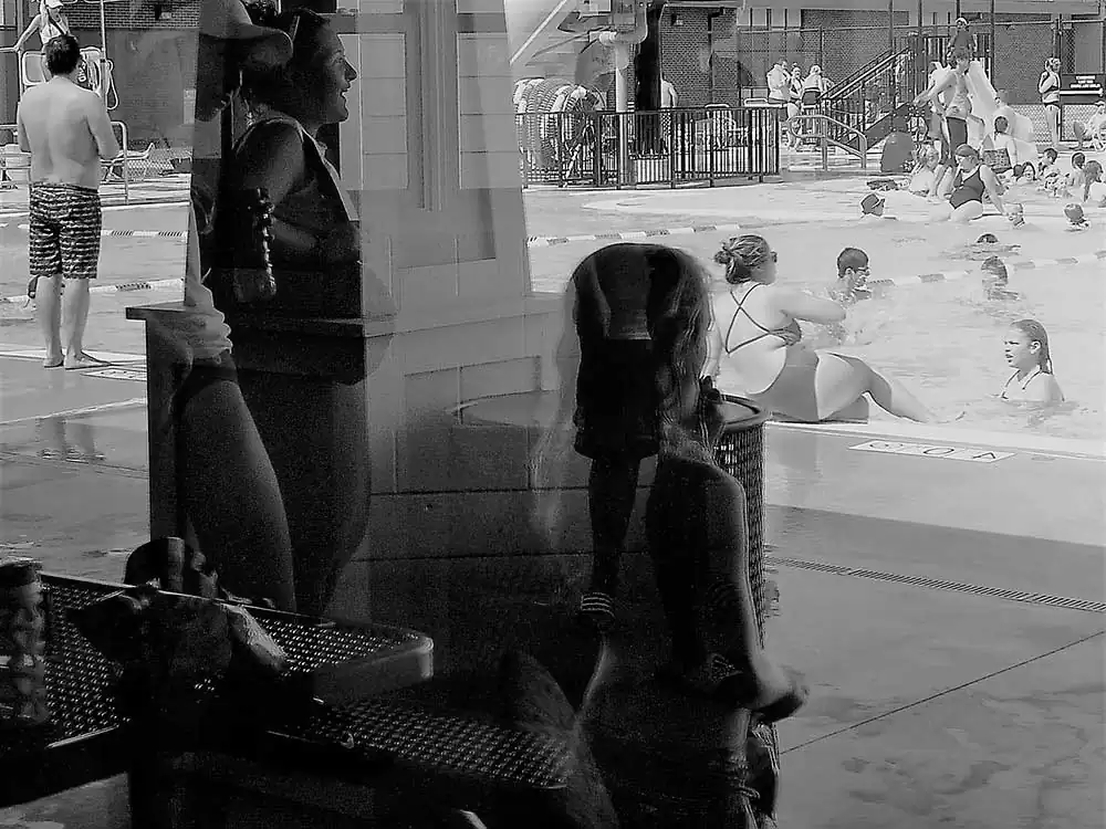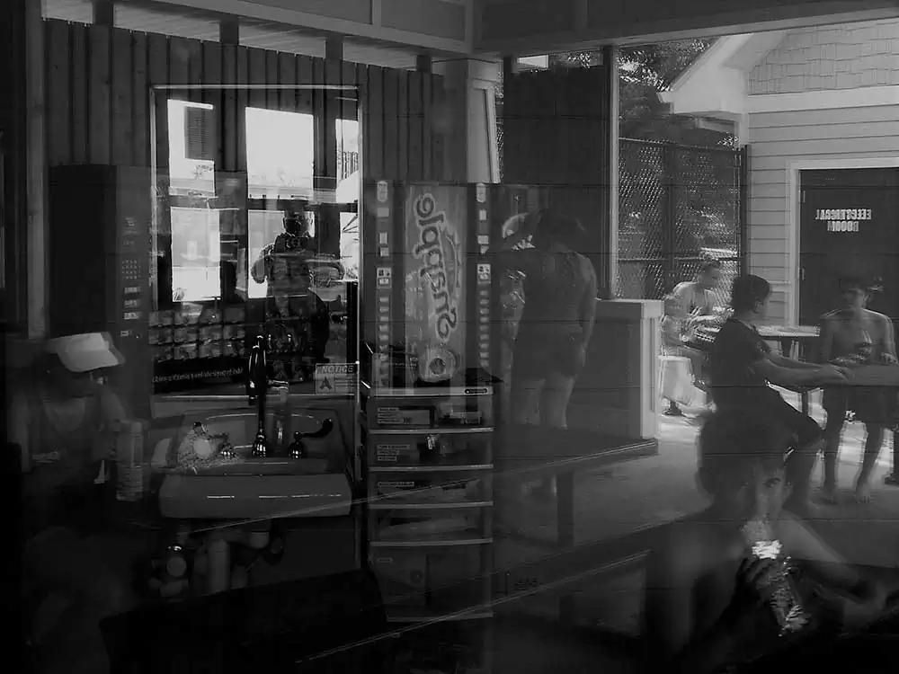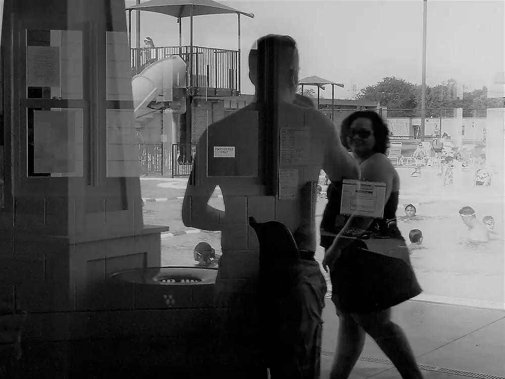 I confess, I am a painter at heart – and, the principles of painting dictate my photography, as the latter does derive its template from the prior. I happen to be at the Chippewa pool twice with my boys. My objective was to study the light and its effect on a small space thick with people. I chose a camera that allowed a small amount, with low resolution. Intention? To occlude light, to derive the occlusion aesthetic in stasis, as well as movement of the bodies in the small waiting area with only one office window in harsh mid-day light – without any sort of definition of their intent. The result is a collection of low resolution palimpsests of people in various activities in their social construct: the swimming pool and its club house.
