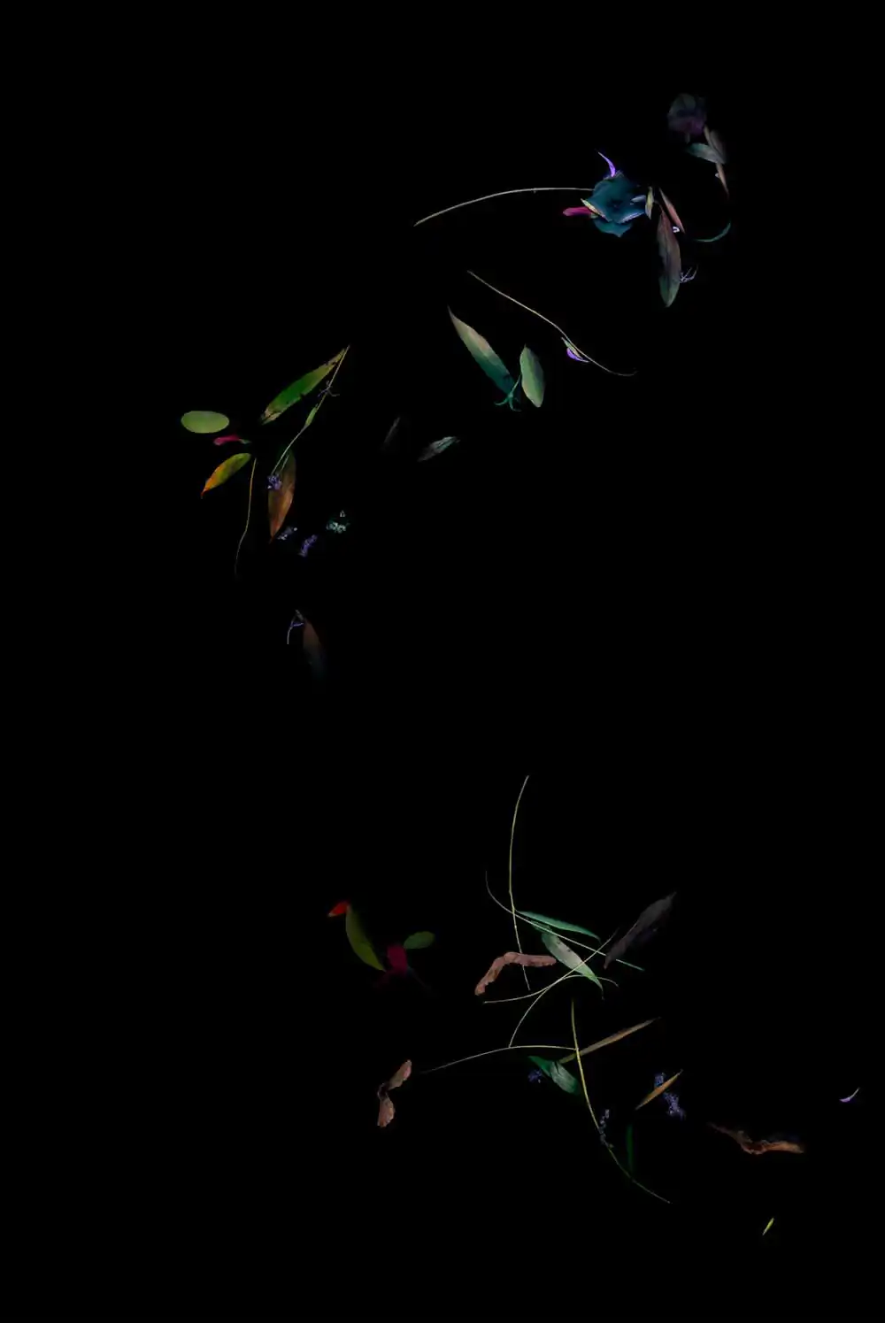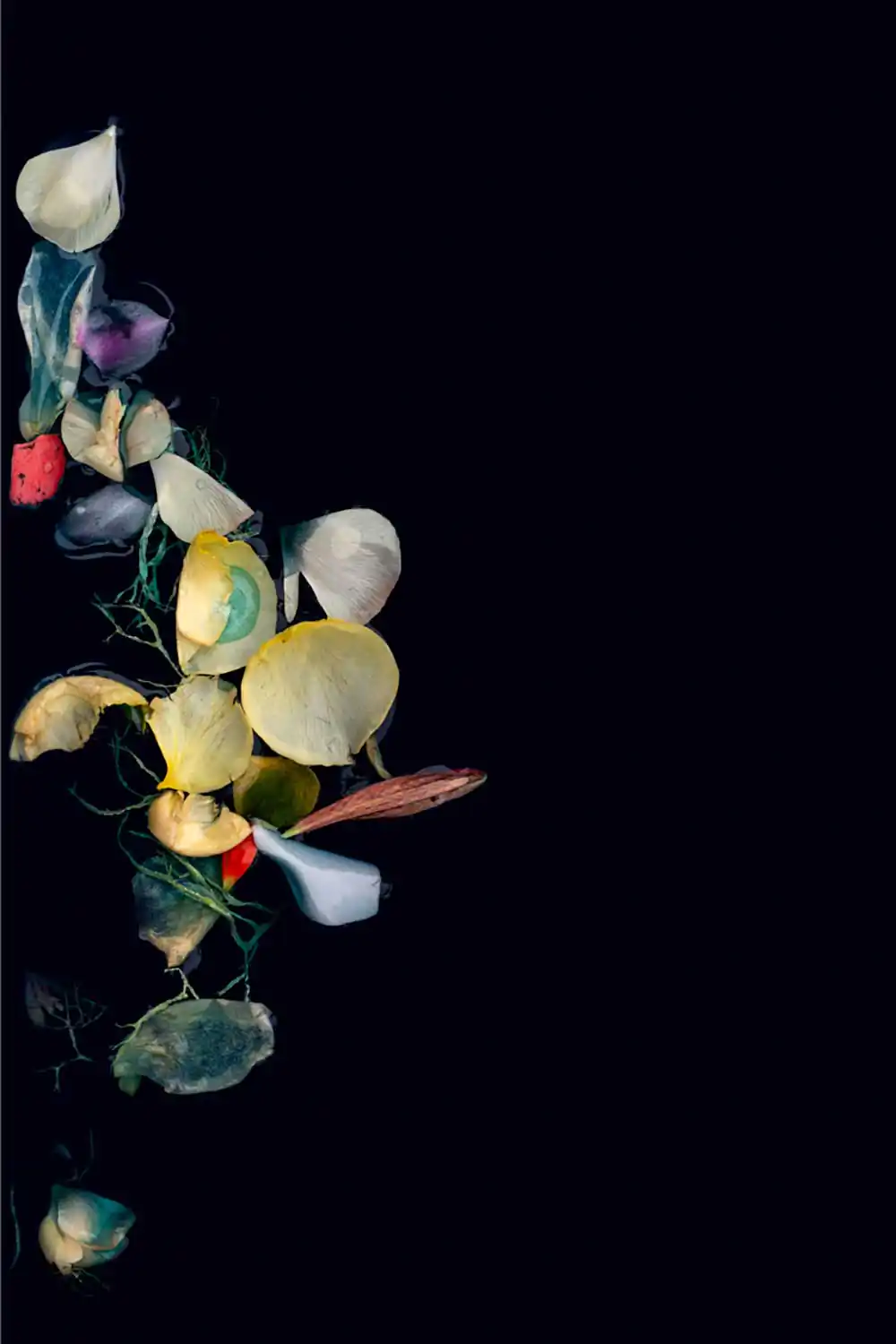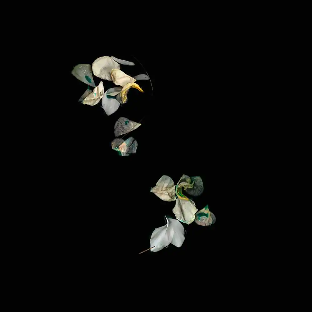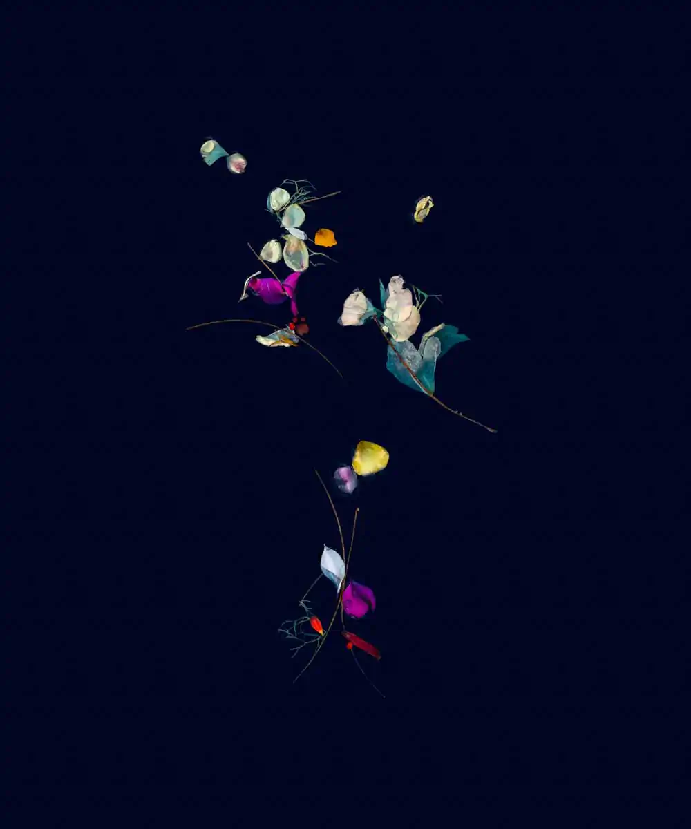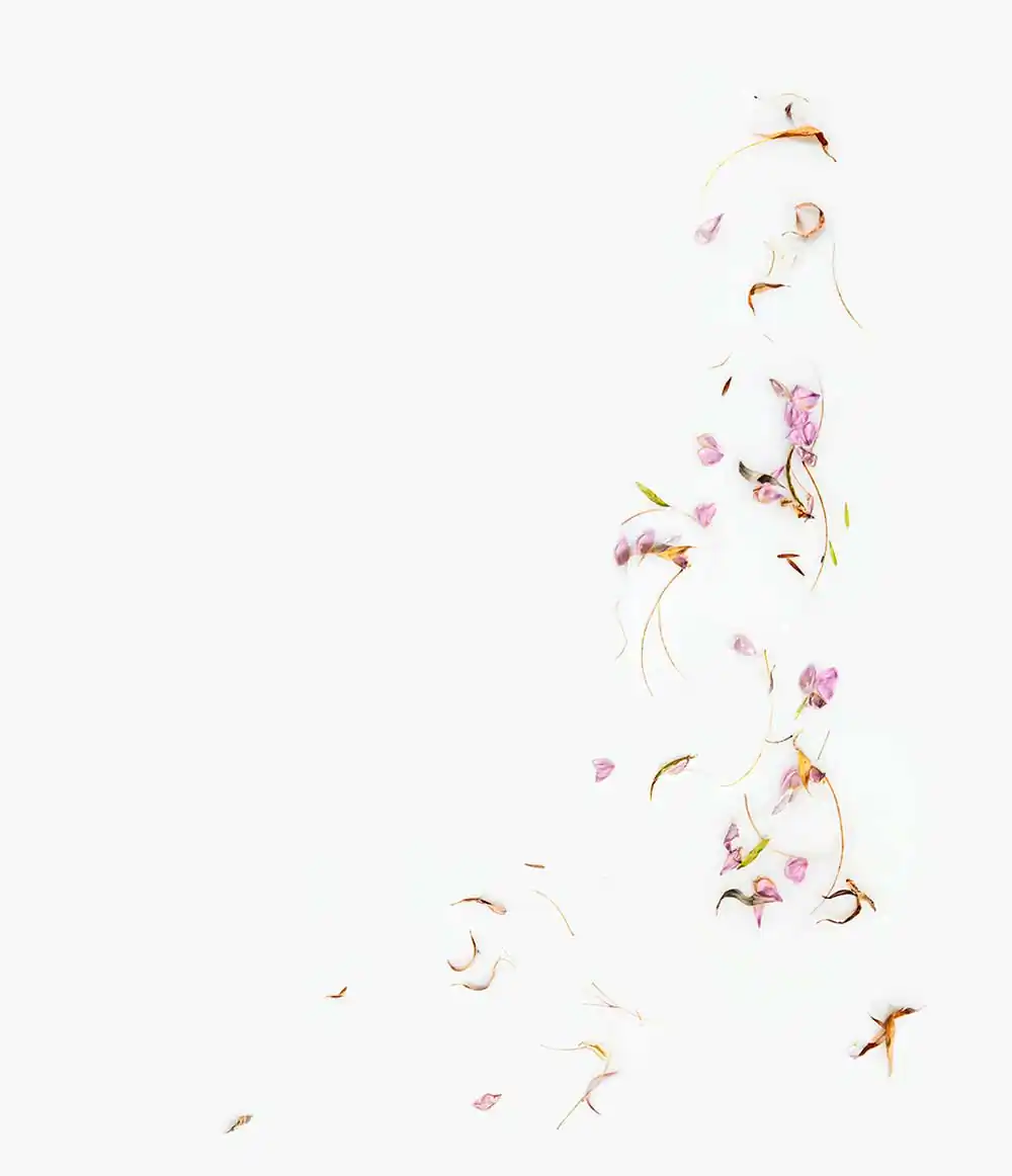 The suspended botanicals in these images convey the delicate push and pull that accompany the process of letting go. Delicate by nature, the blossoms metamorphose with the passage of time and the influence of the elements. Clear waters can appear dark or opaque; vivid memories can slip below the surface only to re-emerge transformed by new meaning. Reminiscent of a ritual bath, these pieces seek to purify, holding for a moment in time the beauty of the past as the self-flows forward.