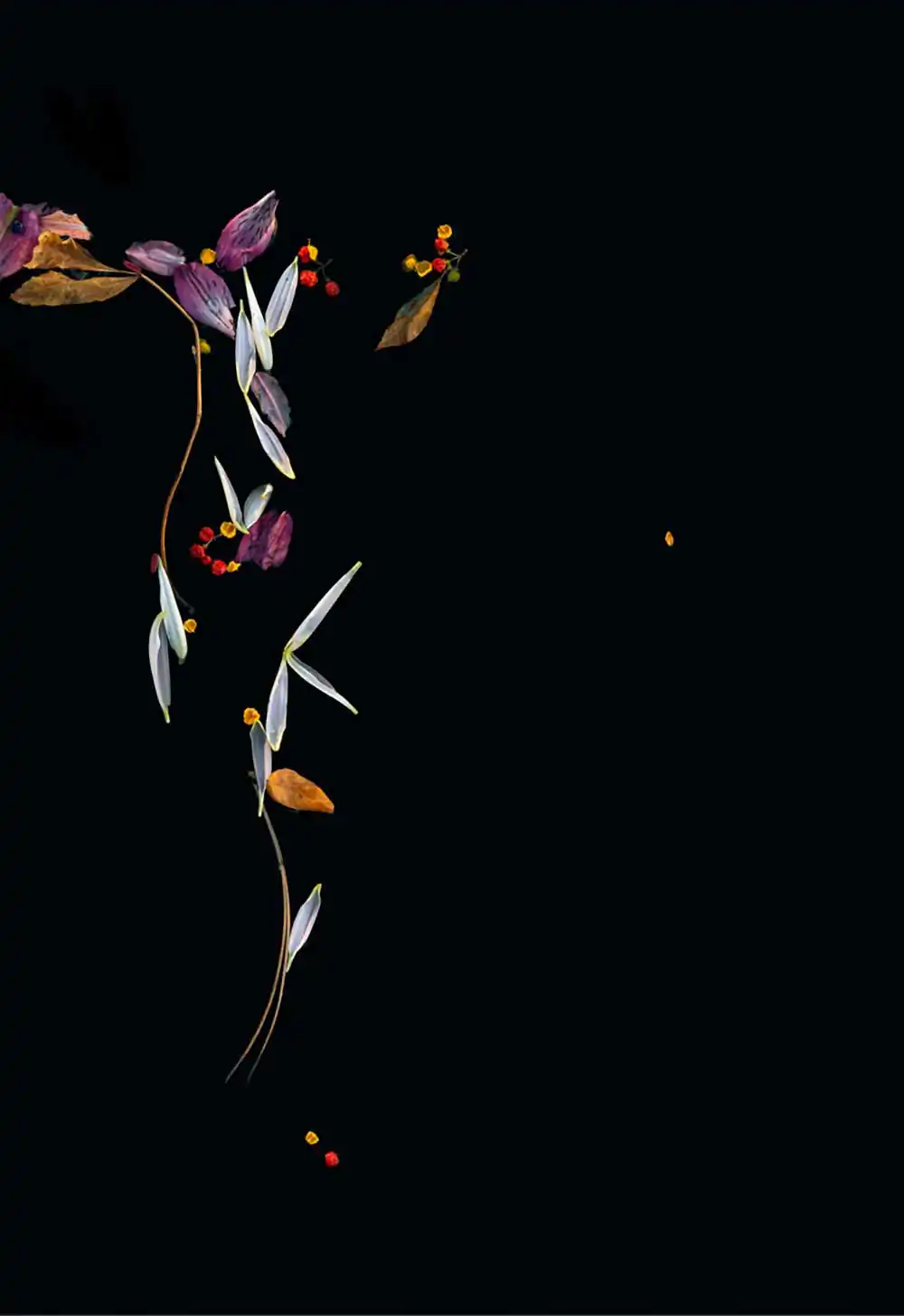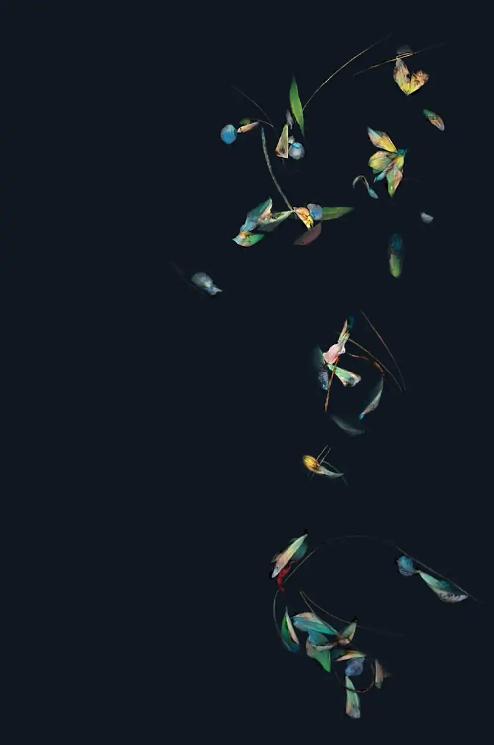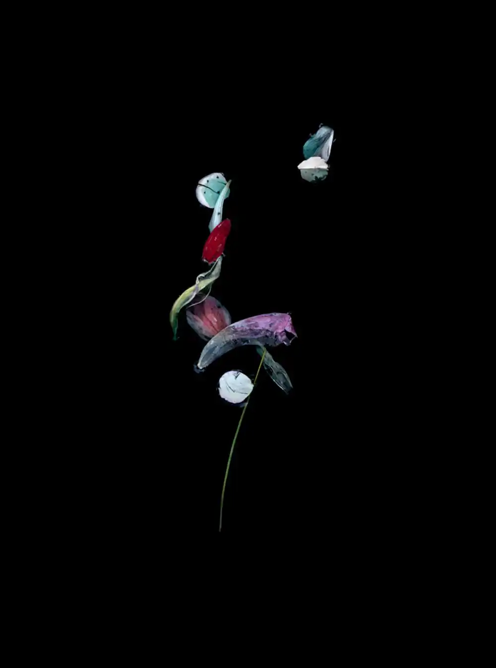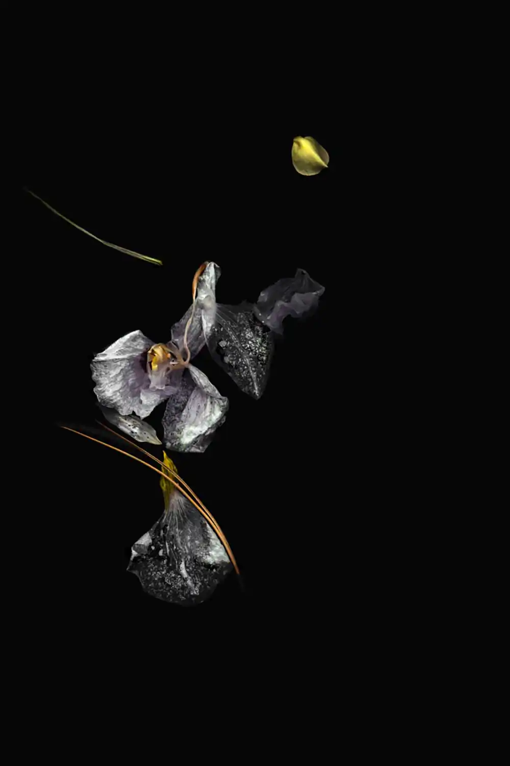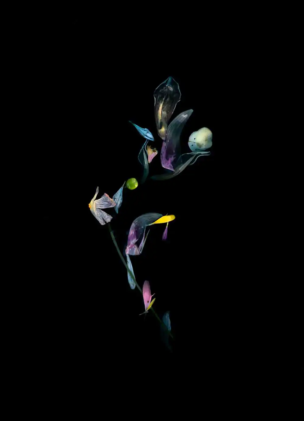 The suspended botanicals in these images convey the delicate push and pull that accompany the process of letting go. Delicate by nature, the blossoms metamorphose with the passage of time and the influence of the elements. Clear waters can appear dark or opaque; vivid memories can slip below the surface only to re-emerge transformed by new meaning. Reminiscent of a ritual bath, these pieces seek to purify, holding for a moment in time the beauty of the past as the self-flows forward.