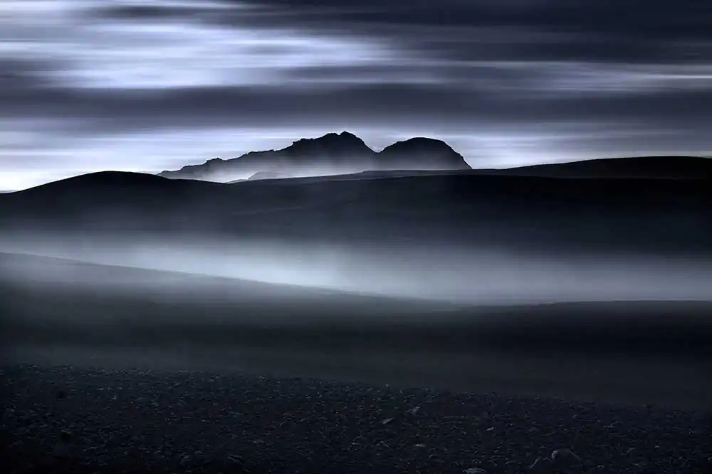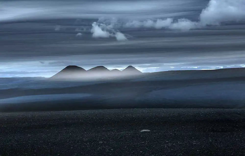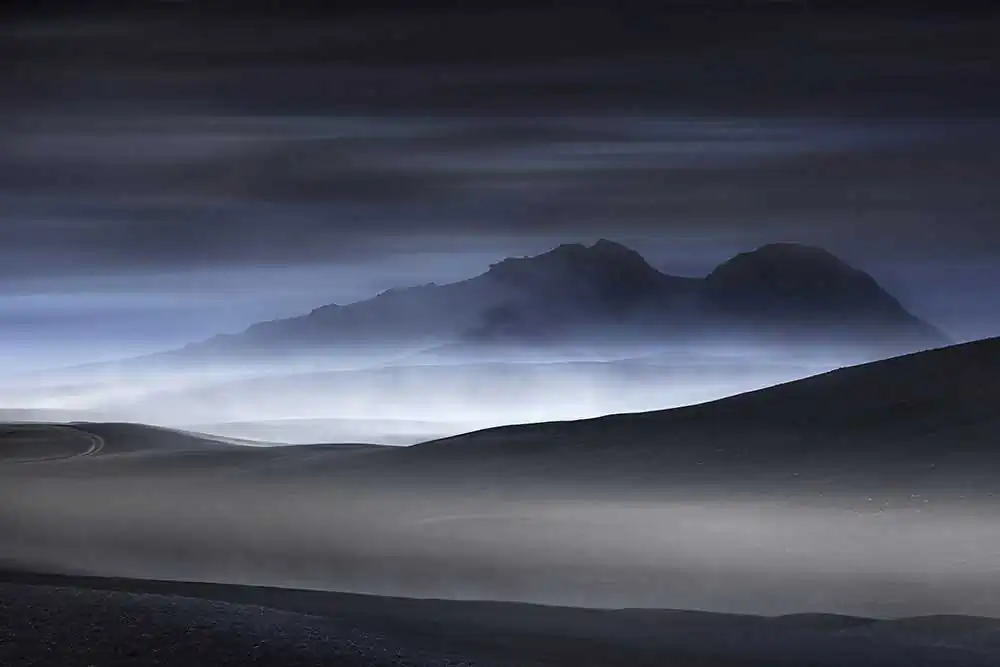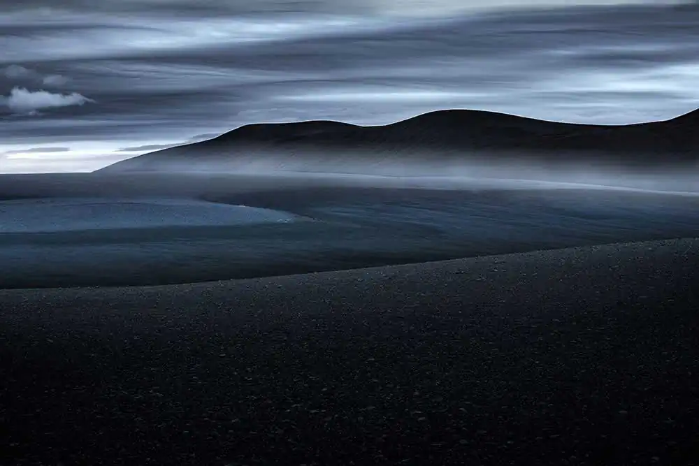 Here we find Iceland in its most mysterious and solitary incarnation—the Iceland of the imagination. The landscapes jostle one another in this small territory, as if struggling to exist and proclaim their independence. Each wants to be the witness, the survivor in the history of this tumultuous isle. So each delves into the original creative chaos to find something to stoke its pride, something to attract attention, to shun the ordinary. Here, the world of certainty ends. Here, we must imagine what we see, for what exists is what we imagine. This is where the Blue Desert begins.