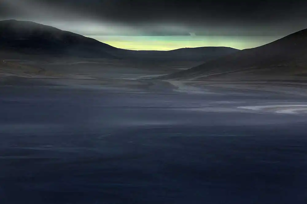 Powdery black ash infiltrates the inland deserts and invades the ocean shore. The mountains seem poised above this blanket of ash. When the wind blows, the mountains float, enveloped in an almost transparent cotton wool, so light it seems to clothe them in the stuff of dreams.