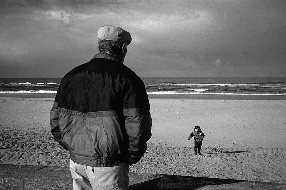 THE IBERIANS / Old fisherman taking care of the grandson at the seashore, Atlantic Ocean, PORTUGAL, EUROPE.