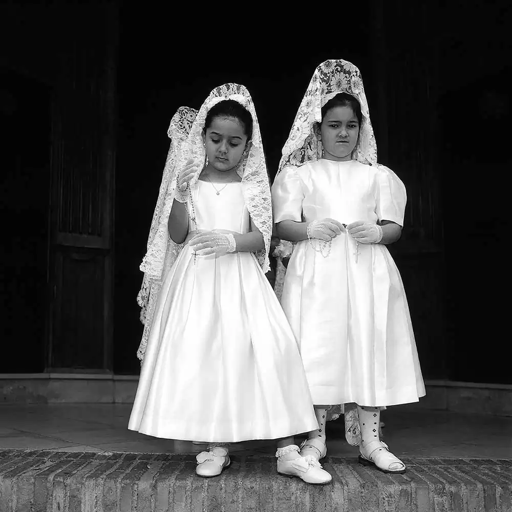 THE IBERIANS / Little ladies with combs and white lace veils at the doors of the Church, putting on their rosary minutes before the procession begins, SPAIN, EUROPE.