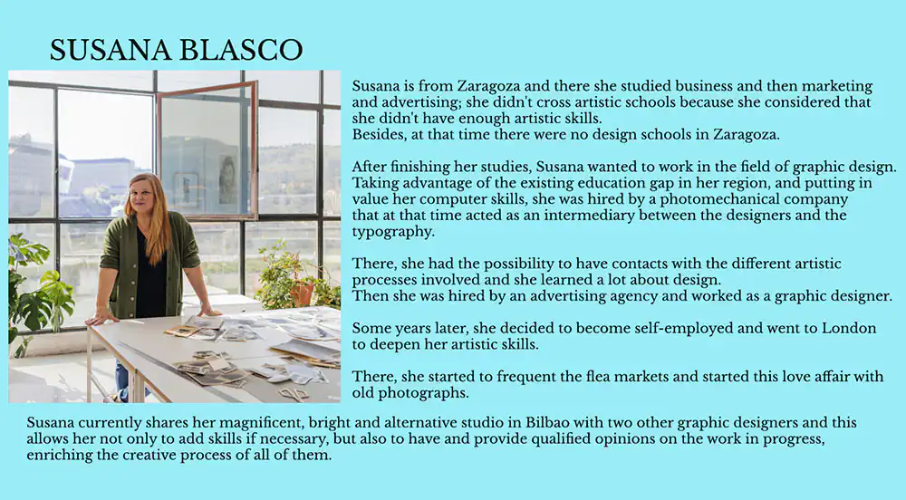 Susana is from Zaragoza and studied business and then marketing and advertising there. She did not go to art schools because she felt she did not have enough artistic skills. Also, at that time in Zaragoza there were no design schools. After finishing her studies, Susana wanted to work in the field of graphic design and, taking advantage of the training gap that there was and her strong skills with the computer, she was hired by a photomechanical company that at that time acted as an intermediary between the designer and the printing company. This gave her the opportunity to have contact with the different artistic processes involved and she learned a lot about design because her job was to somehow “fix” the designs so that they would print well. From there she was hired by an advertising agency and worked in the graphic design and art direction part. She then decided to go freelance and went to London to deepen her artistic knowledge. There she began to frequent flea markets and began this love affair with old photographs.