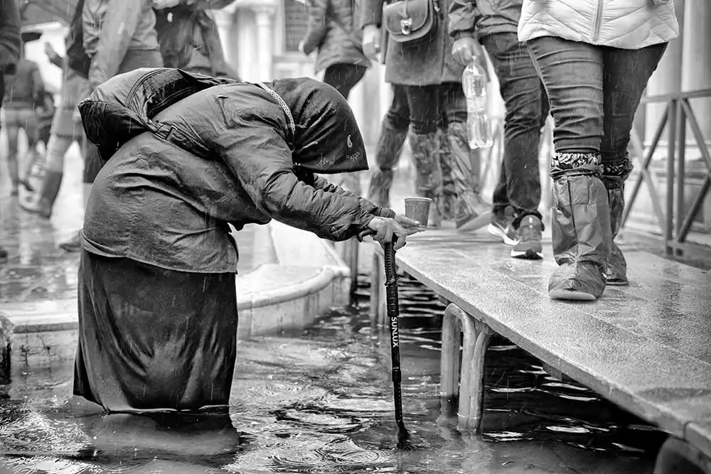 That old lady stood in the high waters for hours, looking invisible to most of the busy crowed.