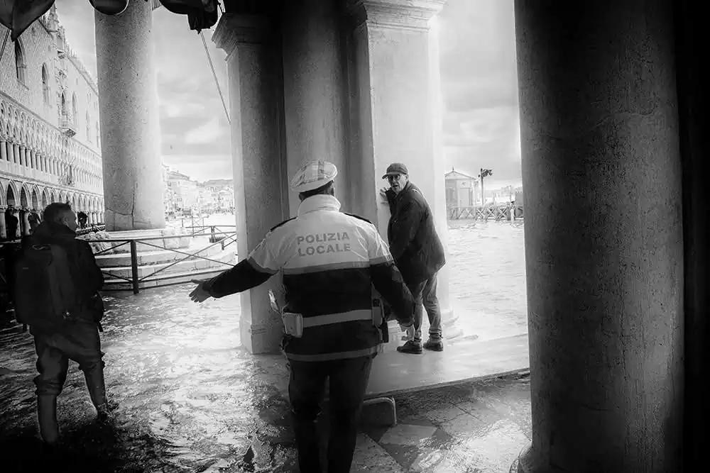 During exceptional high tides, the municipality of Venice places elevated walkways for everyone to walk on. I saw that man coming close to the end of the elevated walkway, then he got scared as the policemen asked him to “undock” to let others go through.
